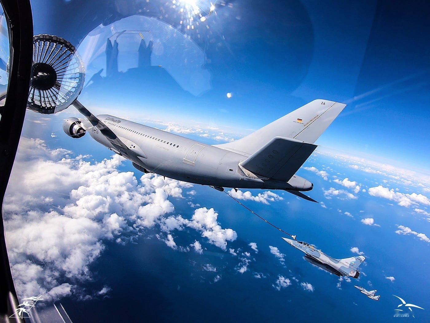 今日幻影 午安 加油|空对空摄影法国空天军(AAE)EC1/2“鹳”中队幻影2000-5F德国空军(Luftwaffe)A310MRTT(4架)和A310MRT(3架)已于2022年退役。军用飞机信息汇 Photo credit: AAE