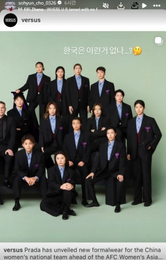 直播吧02月19日讯女足亚洲杯前夕,韩国女足37岁老将赵昭贤在INS上转发了一则中国女足与普拉达合作的大片,配文写道:“韩国没有这样的东西吗...?”