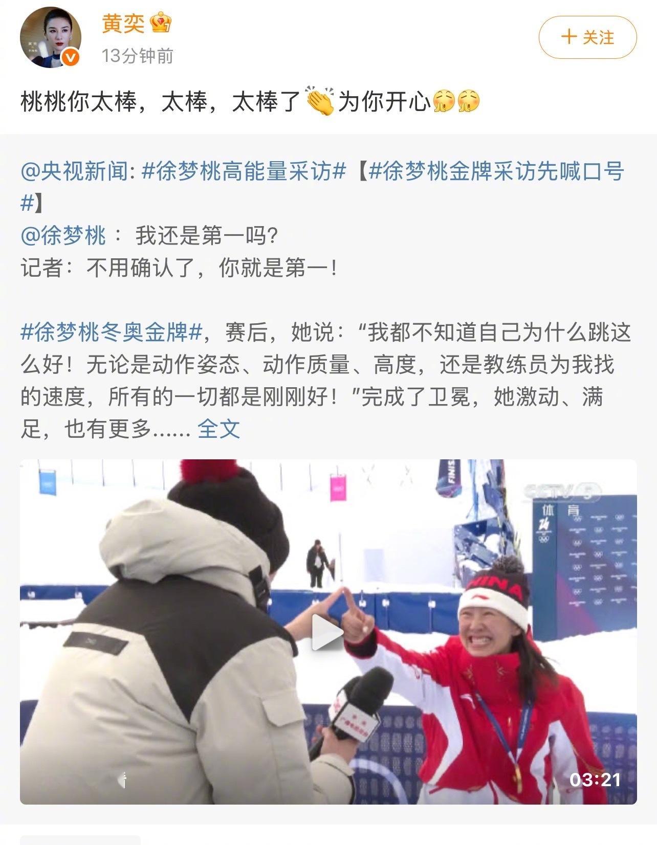 徐梦桃回复黄奕了徐梦桃黄奕梦回浪姐转发祝贺徐梦桃冬奥会拿金牌,徐梦桃回复说:“我