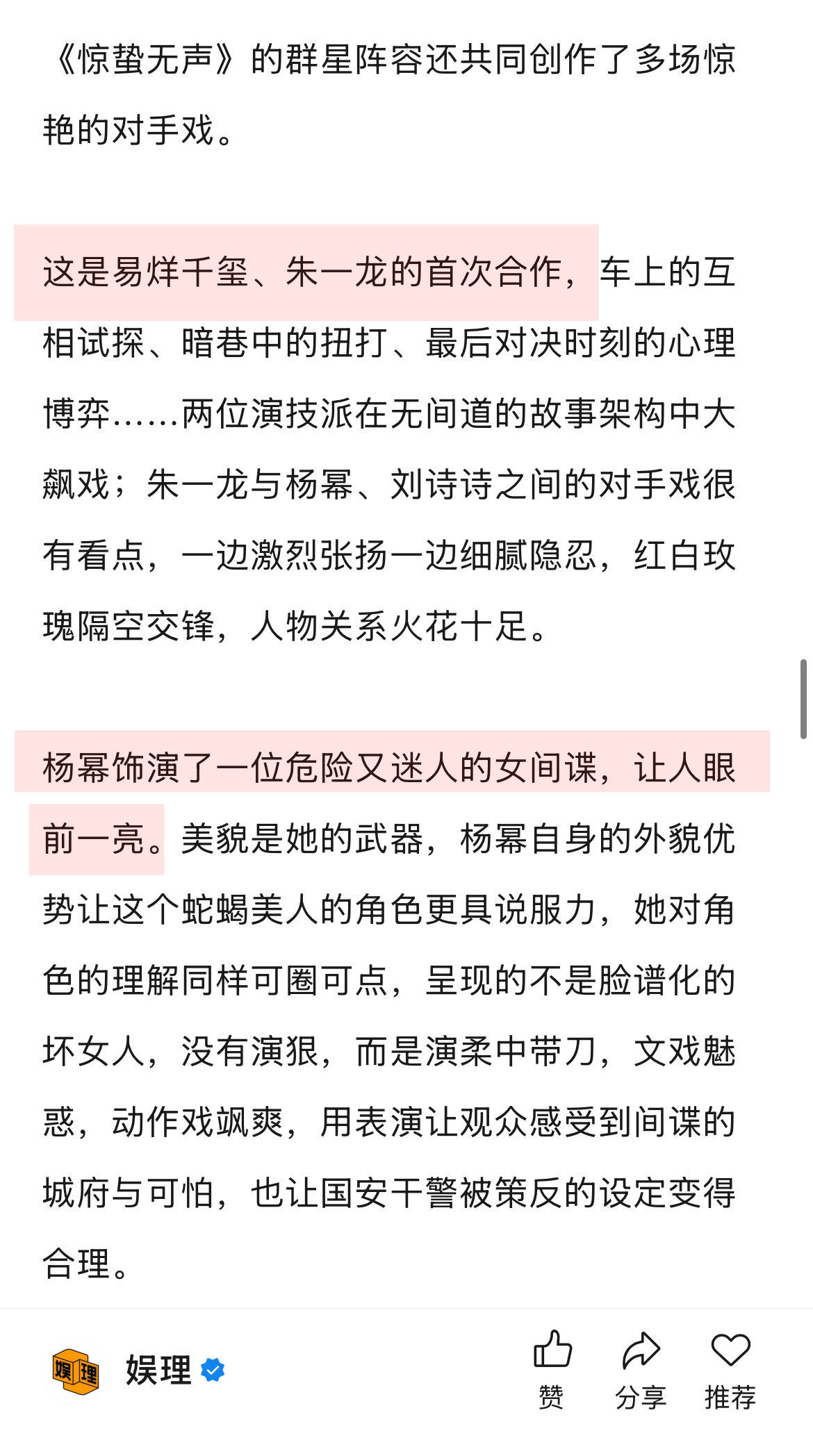 易烊千玺朱一龙撑起了惊蛰无声75岁张艺谋正是创新的年纪 杨幂在《惊蛰无声》中的角色,让人眼前一亮。美貌是她的武器,杨幂自身的外貌优势让这个蛇蝎美人的角色更具说服力,她对角色的理解同样可圈可点,呈现的不是脸谱化的坏女人,没有演狠,而是演柔中带刀,文戏魅惑,动作戏飒爽,用表演让观众感受到间谍的城府与可怕…春节档马上有戏↓