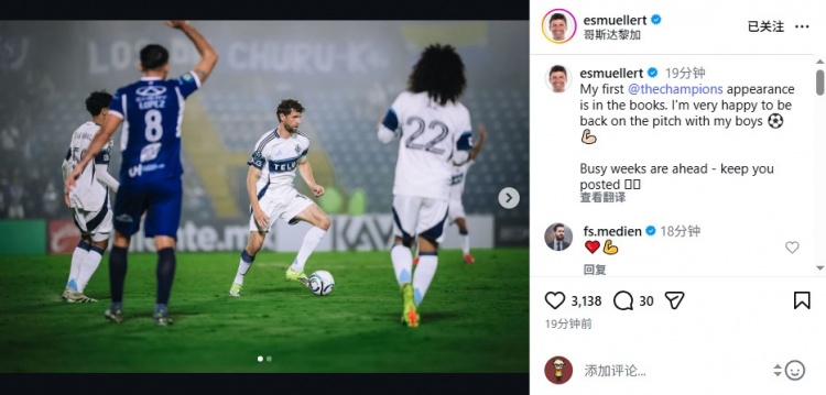 穆勒晒出赛场照,并写道:“我的首次美冠杯出场已经完成,非常高兴能重返赛场与队友们并肩作战⚽”