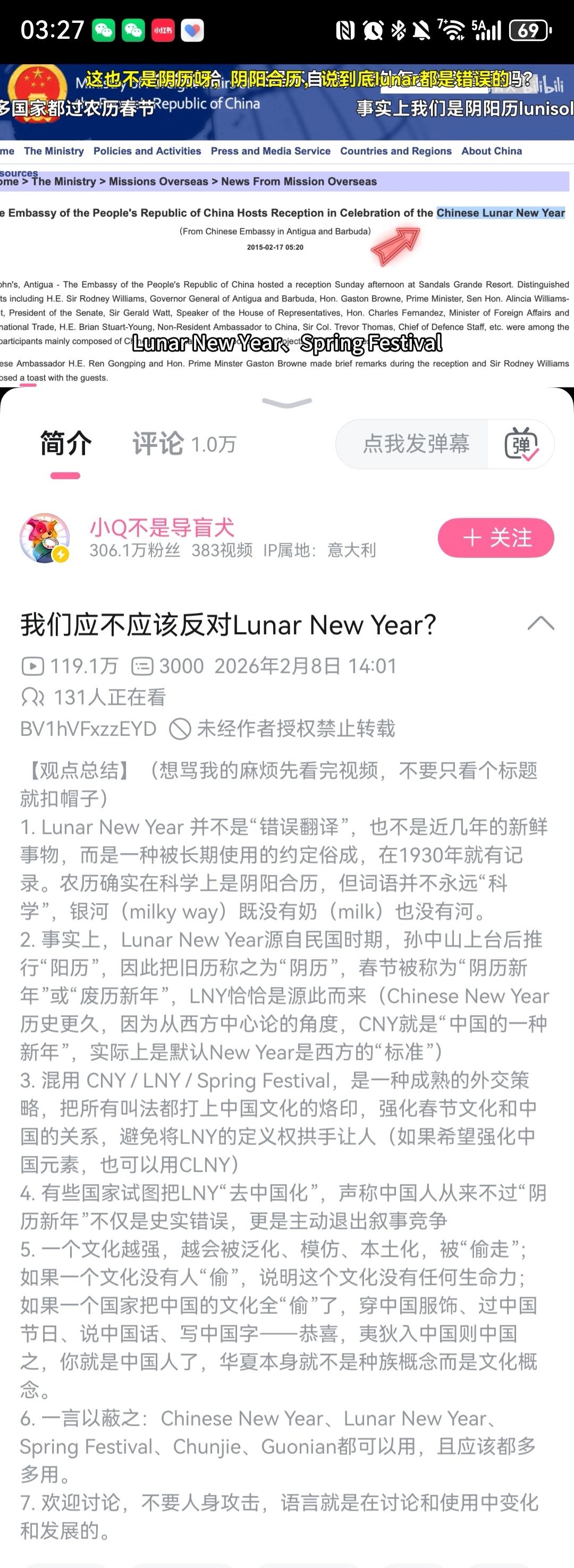 华为的外网账号发的happy lunar new year有人觉得有争议,我也发表下看法看过小Q老师的讲解重点说一下,有些国家在搞lunar new year去中国化,尤其是之前朝贡的那个,他们也过年,但又不想承认是跟咱们有关系,他们想让这个词汇去中国化,有些人也被忽悠了,过年的各种说法都可用,都是跟咱们相关的。