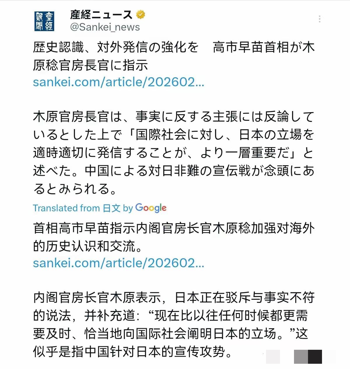 不接受中国的做法,日本再次作出表态!2月19日,根据产经新闻报道,日本内阁官房长官木原稔在19日的记者会上声称,首相高市早苗指示他在第二届内阁就职后,要加强在领土问题和历史认知方面的沟通。内阁正在驳斥与事实不符的说法,现在更需要及时、恰当地向国际社会阐明日本的立场。 木原稔这番话,说白了就是日本新内阁准备在国际上“打嘴仗”了。他们觉得之前在国际场合吃了亏,被中方“怼”得没话说,现在要组织力量“反攻”,把“话语权”抢回来。这背后其实暴露了日本外交的一个老毛病:只许自己放火,不许别人点灯。他们可以随意发表涉台错误言论,挑战中国底线,但一旦中方反击,他们就跳脚说“不符合事实”,还要去联合国告状。这种“双标”玩法,在国际上其实挺招人烦的。 日本这次所谓的“加强沟通”,说白了就是想把“黑的说成白的”。比如在钓鱼岛问题上,他们一直嚷嚷那是“日本固有领土”,完全无视历史事实和法理依据。现在他们觉得光在国内喊口号不够,得让全世界都听他们的。这种“洗脑式”宣传,其实是在破坏地区的和平稳定。国际社会不是傻子,大家心里都有一杆秤,日本这种歪曲历史的做法,最终只会让自己在国际上更加孤立。 高市早苗这个人,大家应该不陌生,她是出了名的“鹰派”。她上台后,日本的外交政策明显更加强硬,尤其是在涉华问题上。这次她指示木原稔加强“领土和历史”沟通,其实就是想借机炒作“中国威胁论”,为日本扩军备战找借口。这种把戏我们见得多了,但玩火者必自焚,日本如果继续在错误的道路上狂奔,最终受伤的只会是他们自己。 日本现在最应该做的,不是去国际上“狡辩”,而是好好反思自己的历史问题。二战已经过去这么多年了,日本却始终不敢正视历史,甚至还试图美化侵略行为。这种态度,不仅伤害了亚洲邻国的感情,也让日本在国际上失去了信誉。如果日本真想得到国际社会的尊重,就应该拿出诚意,承认历史错误,而不是一味地“嘴硬”。 各位读者你们怎么看?欢迎在评论区讨论。