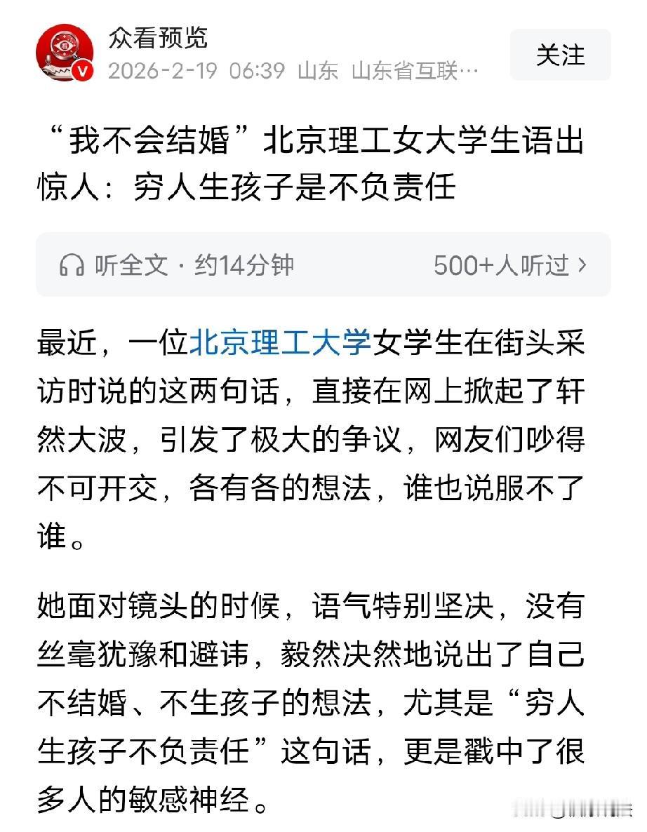 “我不会结婚,”北京理工大学一23岁女生,直白表示:我不理解,穷人还要生育?孩子出生面临 穷、容易自卑,胆小,这不是坑孩子吗?我不会要孩子,有人问她:那你老了怎么办?女子犀利回答引争议。 据众看预览2月19日报道,一段2025年的街头采访女大学生的视频,又冲上微博热搜,引起大家积极的讨论。 接受采访的是一名北京理工大学的女学生,她23岁,却有着和常人不同的犀利观点。 记者:你以后打算结婚成家吗? 女生:不打算,我不结婚,也不会要孩子。 记者:为什么会有这种想法? 女生:因为现在生活压力太大了。我特别不理解经济条件不好的人为什么要生孩子。如果孩子生下来就物质匮乏,不仅容易自卑胆小,可能还要用一辈子去治愈童年的阴影,这对孩子来说是不负责任,简直就是坑孩子。 记者:可是老一辈的人条件也不好,不也照样把一堆孩子拉扯大了吗? 女生:那是因为上一辈赶上了时代红利。他们总把“吃苦”挂在嘴边,但我认为困难本身并不值得追求和推崇。 记者:那你考虑过,等你老了,以后孤独无依怎么办吗? 女生:我觉得活到五十多岁就够本了,就算晚年受点苦也没什么。 记者:如果大家都像你这么想,社会老龄化问题变严重了怎么办? 女生:这跟我有什么关系? 女生的观点一抛出来,网友们也参与讨论中,但是,大家看法也分成两端。 有人说:这女孩就是个纯粹的利己主义者。从来不会考虑传统、传承、责任;自私自利的只想自己快活、省心省力,不想承担养育孩子的责任。 只能说明当代一部分年轻人不负责任,更自私,更没有社会责任感,他们以这种方式宣泄对社会不满,认为社会没给他们优厚的条件,所以穷就别生孩子。从根上看,是自私懒惰! 但也有人觉得这位女生说的,有一定道理,一个孩子从生下到养育成人,养育费,教育费,住房费,婚姻费得多少钱,一般的穷人压力太大了,这是一。 其二,穷人的孩子在成长过程中,生活穷困,吃穿住都处在低层,往往受到富人孩子的歧視和霸凌,使孩子产生自卑心理,孩子在被人歧视下成长,何言幸福?所以,女生讲的有一定道理。贫穷不生孩子真的是一种善良。 当然也有中立客观,从现实角度看待的人表示,其实她已经给出了答案,养老,医疗,教育,住房,工资这些个问题不解决,年轻人很多都不结婚,不生孩子,我身边就有好多。 其实,女生的观点也是出于对现实的考量,仅代表她个人看法,但这个话题很有探讨性。 不过,法律上可没“穷人不该不该生”这一说。生育权是每个人的基本权利,跟钱多钱少没关系。 就像有人穷但爱孩子,有人富却不管娃,法律只保护“想生就生、不想生就不生”的自由,不会因为穷就剥夺当父母的资格。 《妇女权益保障法》第51条明确规定:妇女有按照国家有关规定生育子女的权利,也有不生育的自由。 同时,《民法典》第1041条规定:婚姻家庭受国家保护,实行婚姻自由、生育自由的婚姻制度。 这两条法律共同确立了公民的生育权不受经济条件、社会地位等因素非法干涉的基本原则。 女大学生的话像面镜子,照出了两代人对生娃的不同理解。 老一辈觉得有口饭吃就能养娃,年轻人却算着奶粉钱、学区房、兴趣班,被压得喘不过气。 不过,生娃不是任务,得量力而行——既不能因为穷就否定别人生娃的权利,也不能鼓吹砸锅卖铁也要生,毕竟孩子出生后,父母得对他的幸福负责。 其实,这件事个人认为,年轻人少点焦虑;个人则根据实际情况做选择,别盲目跟风,也别用“穷”当借口逃避责任。毕竟,法律能保护权利,但孩子的幸福,还得靠爱和行动来支撑。 那么,你对女生的观点有什么想说的?