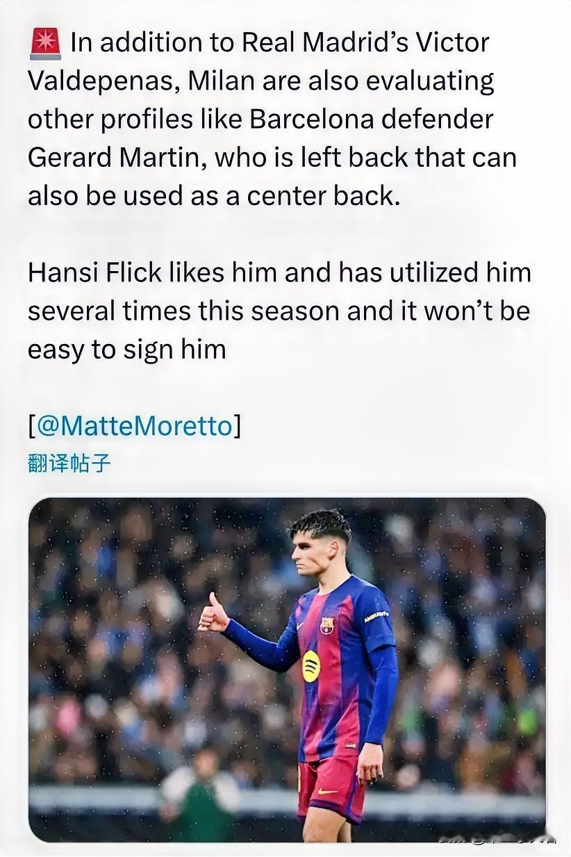 杰拉德·马丁!米兰对巴塞罗那后卫杰拉德·马丁充满兴趣,米兰希望在夏季窗口开启之前有机会从巴塞罗那俱乐部签约杰拉德·马丁。这个杰拉德·马丁身价不低,德转身价差不多有两千万,但哥们之前租借去低级别联赛貌似都不是绝对主力。 米兰俱乐部除了对皇家马德里后卫维克托·巴尔德佩尼亚斯感兴趣之外,米兰也在评估另一支西甲豪门巴塞罗那俱乐部的球员,来自巴塞罗那的后卫杰拉德·马丁。杰拉德·马丁是一名左后卫,也可以作为中后卫,他是巴塞罗那俱乐部比较看重的球员,但球员成长速度好像并不能令巴塞罗那俱乐部满意。 杰拉德·马丁在巴塞罗那俱乐部青年队表现十分亮眼,但进入成年队后貌似一直不是很好,他之前租借过多支球队,其中还有西乙这样的低级别联赛,但杰拉德·马丁均未在球队站稳脚跟,本赛季杰拉德·马丁貌似有点受汉斯·弗里克很欣赏,本赛季已经多次使用过他。