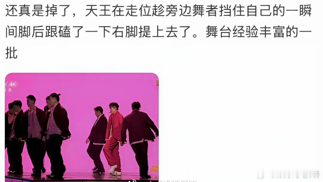 原来春晚上,王一博和郭富城跳的那个舞,背后故事这么精彩。天王郭富城跳舞的时候,不小心鞋子被踩掉了。要知道当时舞蹈动作特别大,节奏也特别激烈,鞋子掉了应该是特别严重的失误了。结果没想到郭富城稳如泰山,趁着镜头没拍自己,悄咪咪地把鞋子用脚提了上去。光看春晚的直播,相信很多人都不知道郭富城鞋跟有问题。这说明什么,说明人家郭富城还是有真本事的。换成其他演员,估计早就慌了吧。