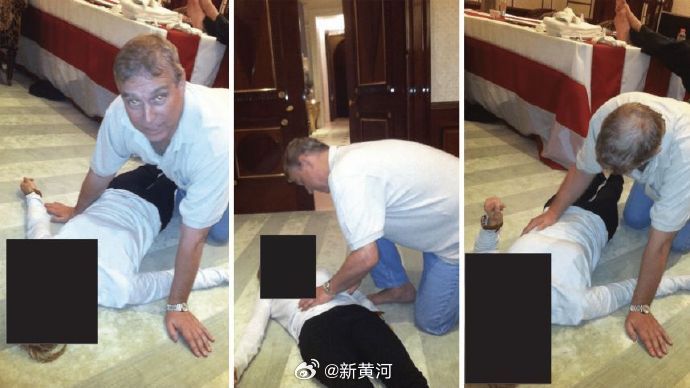 在一张未标注日期的照片里,安德鲁跪爬在一名名衣着完整、面部被模糊处理的女性上方,目光直视镜头。另两张照片中,安德鲁的手放在此人的腹部位置。背景中,还有一名身份不明者将双脚搭在桌上,桌上堆放着一摞毛巾。