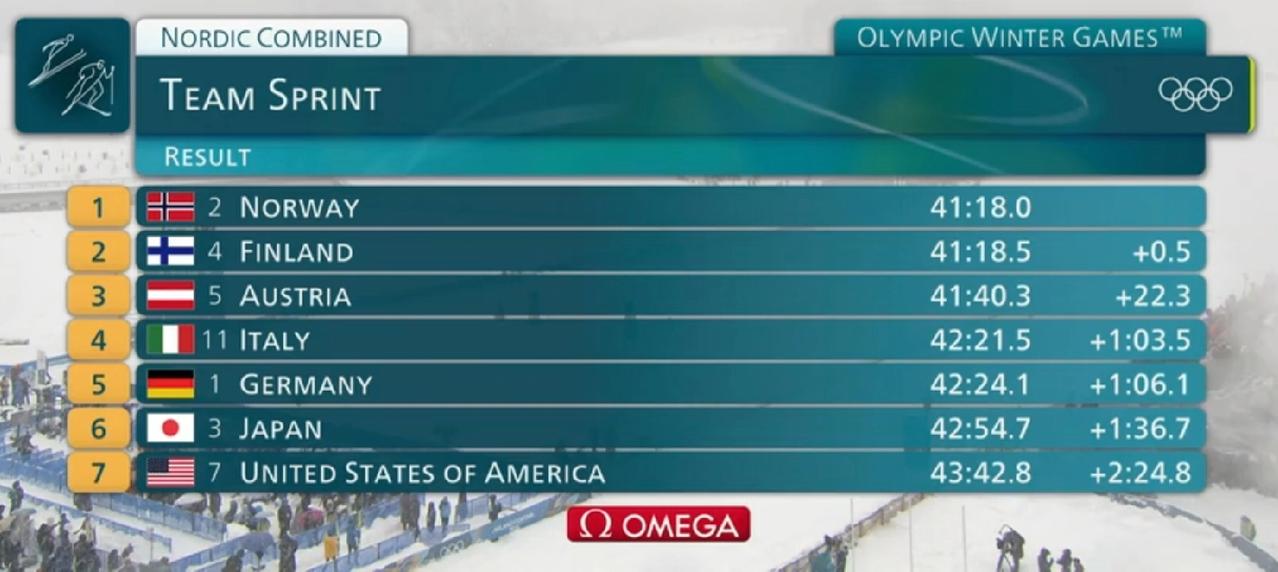 北京时间2月19日,挪威在北欧两项团体短距离越野滑雪2×7.5公里比赛中以0.5秒险胜芬兰夺冠,芬兰摘银,奥地利获得铜牌,这样挪威队就包揽了米兰冬奥这个项目的所有3枚金牌,而这个项目的银牌和铜牌被芬兰和奥地利瓜分。 这场比赛令人感慨较深的是日本队竟然力压美国、法国等欧美强队获得第六,成绩只比冠军挪威队慢1分36.7秒,而中国队也参加了本场比赛,但是最后一个完成比赛,用时比挪威队慢9分29.8秒,这差距确实有些悬殊,所以说日本队本届冬奥整体实力强大是有原因的,令欧美强队都不敢轻敌。