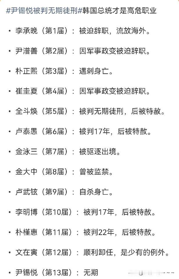 夜已深,突然想! 韩国总统在韩国就是高危职业。 这也不是吹牛逼,也不是胡编乱造,这是经过时间检验的,经过实践检验的,实事求是的,不带水分不容置疑的结果。当然更不是谣言。因为你从头到尾看看我这图二的总结就知道了,韩国历任总统从第1届到第13届可以说结局并不怎么完美。情况就是这么个情况。[玫瑰]