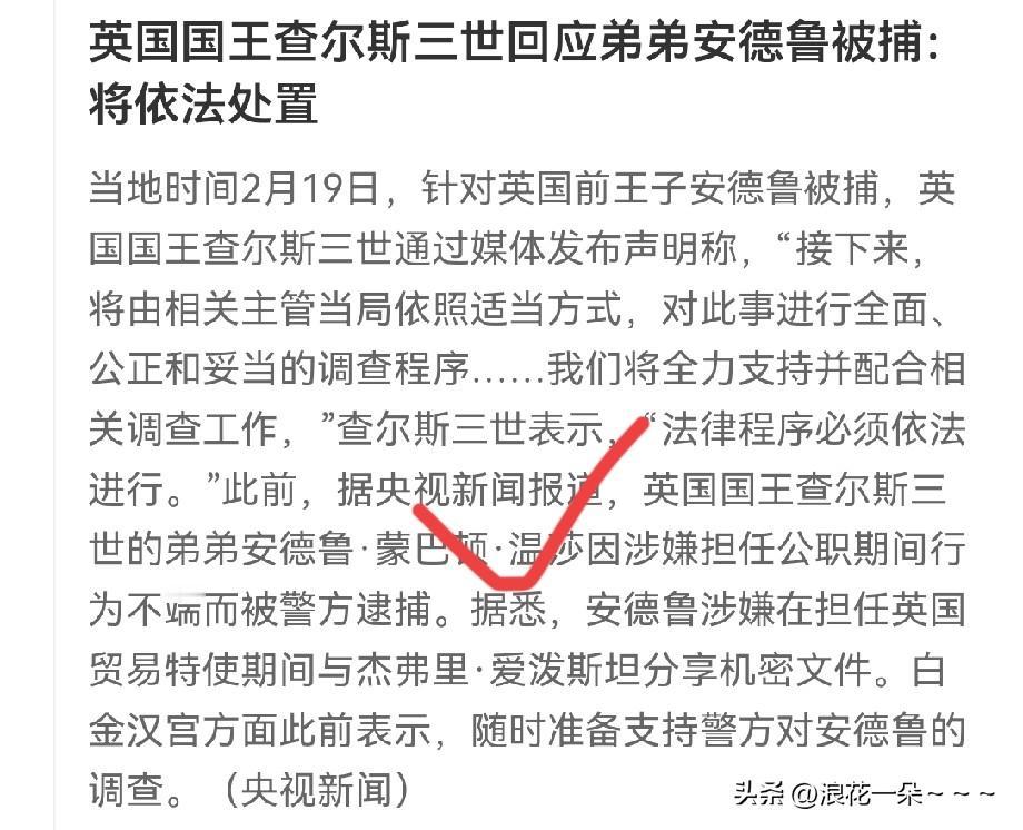——依法处置—— 安德鲁被捕,英国国王的发声真是郑地有声!这真是法治国家的典范啊!弟弟被抓了,哥哥毫不留情,依法处置,该怎么办就怎么办?按照法律程序来,意思是绝不靠人情,靠关系,靠门户? 人家都说,不要“”本是同根生、相煎何太急”,那多残酷啊!然而,在英国,你看,可没有这一说。英国国王查尔斯三世看上去一点也不急。完全体现了在英国法治大于人治。我认为这一点美国可以好好学习一下。