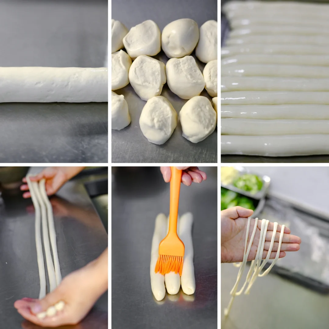 1.500克中筋面粉,3克食盐,240克温水,少量多次加入凉水,成絮状之后揉成团,醒20分钟。然后再次揉成光滑的面团,醒10分钟。让面团里的蛋白分子充分松弛,继续揉成十分光滑的面团之后,搓成长条,刷上一层食用油,分成均等大小的剂子,搓成长条,再次刷上食用油,密闭醒发1个小时以上。