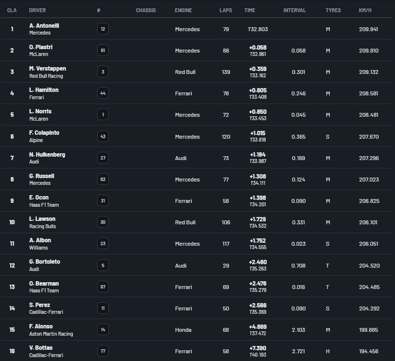 哈斯、小红牛和威廉姆斯车队分列第七到第九位,且里程数都超过了100圈。塞尔吉奥-佩雷兹驾驶的凯迪拉克赛车以1分35秒369的成绩位列第十。