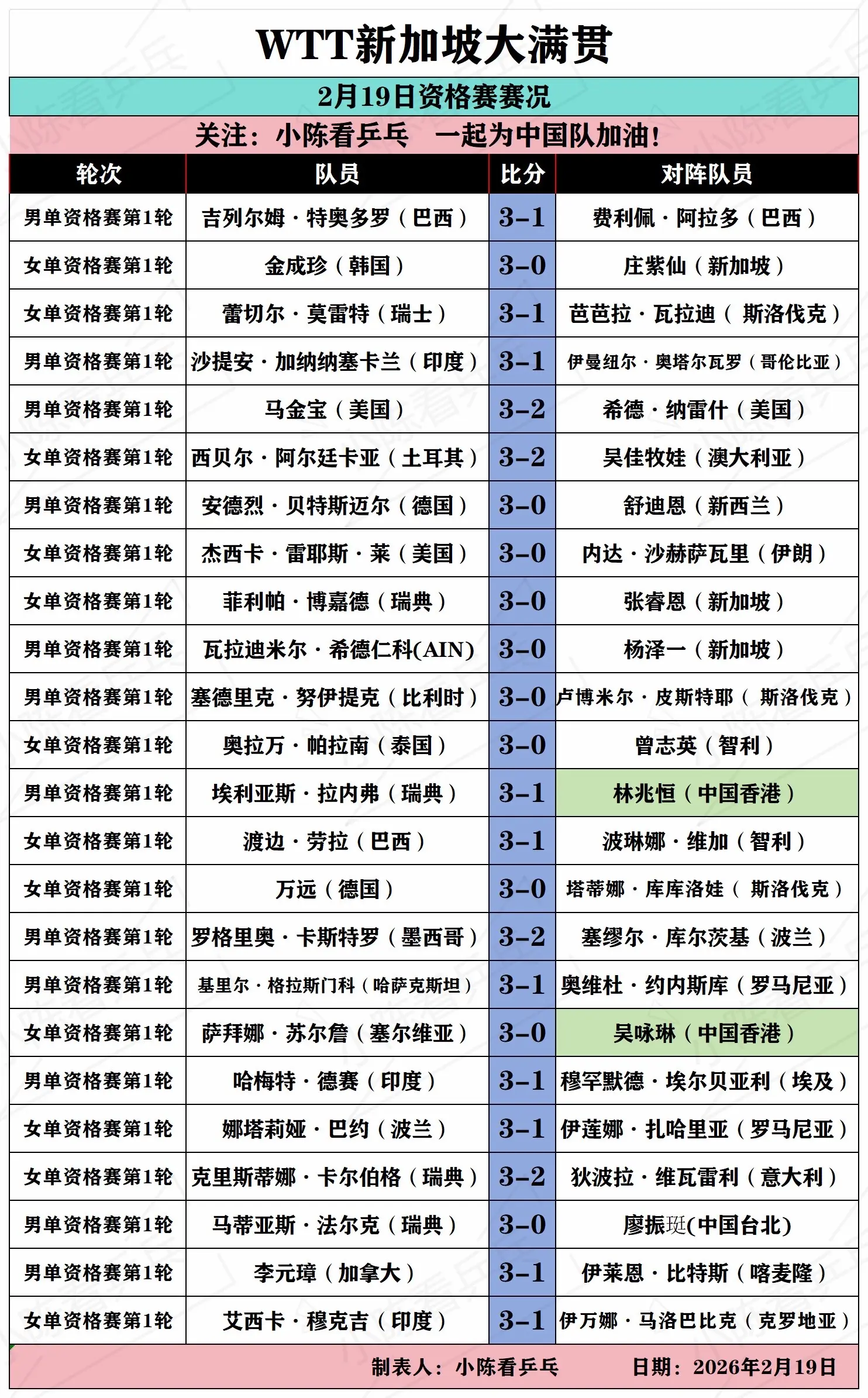 WTT新加坡大满贯2月19日资格赛赛况。WTT新加坡大满贯2月19日资格赛赛况,资格赛没有中国队员参加。