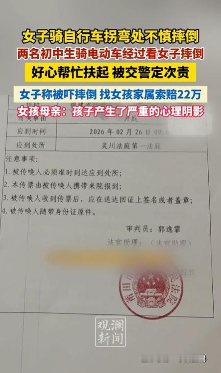 福建,一老太太骑自行车拐弯摔倒,2个初中生女孩骑电动车经过,看女子摔倒,好心把她扶起来,女子却一口咬定,她是被2个女孩吓到摔倒的,2个女孩竟被交警定次责,女子跟女孩家长索赔22万。 2025年3月15日下午,福建莆田市城厢区东海镇上图村一处十字路口,发生了一起原本普通却引发巨大争议的交通纠纷。两名14岁的初中女生放学后骑电动车结伴回家,途中目睹一位朱姓老太太骑自行车拐弯时突然失衡摔倒。出于本能和善意,两人立即停车上前搀扶,并询问是否需要联系家人或送医。 事情却在这一刻发生转折。老太太当场表示,自己是被两人骑电动车“吓到”才摔倒的,认定她们负有责任。双方各执一词,最终报警处理。 交警随后出具道路交通事故责任认定书,认定两名女生承担次要责任。理由主要有两点:其一,两人未满16周岁驾驶电动车,属于违法行为;其二,在转弯过程中对老太太形成“视觉压迫”,导致其避让失控摔倒。该认定一经公布,引发舆论哗然。 从公开的监控画面来看,老太太摔倒时,两名女生刚从路口驶出,与其之间没有任何肢体接触,距离也尚未接近。画面还显示,老太太是在避让一辆突然出现的白色轿车时向右倾斜,重心不稳而倒地。也就是说,直接导致其失控的因素,可能是避让机动车,而非两名女生的骑行行为。 尽管如此,老太太仍依据责任认定书,将两名女生及其法定监护人诉至法院,索赔224307.73元,项目包括医疗费、护理费、营养费、误工费、残疾赔偿金、精神损害抚慰金等,并要求承担全部诉讼费用。而据公开资料显示,老太太住院12天,实际医疗支出约2.67万元。索赔金额与实际花费之间存在较大差距,这也成为争议焦点之一。 对两个普通家庭而言,二十多万元并非小数目。孩子母亲表示,自己只是普通打工者,根本无力承担如此赔偿。更让家长难以接受的是,孩子只是出于善意扶人,却因此成为被告。 事件发生后,两名女生的心理状态明显受到影响。原本活泼开朗的孩子变得沉默寡言,不愿出门,也害怕再次面对类似情境。她们开始怀疑,课本里倡导的“助人为乐”,在现实中是否真的可行。身边同学得知此事后,也产生顾虑:遇到类似情况,还要不要伸手帮忙? 案件的争议核心,在于违法行为与损害结果之间是否存在直接因果关系。未满16周岁骑电动车,依法应受到行政处罚或教育,这是明确的。但侵权责任的成立,除了过错外,还必须具备损害事实及因果关系。如果违法行为与损害后果之间不存在必然联系,仅因“违法在先”就承担赔偿责任,是否符合法律逻辑,成为讨论重点。 所谓“无接触事故”在司法实践中确有存在,但通常要求一方的过错行为对另一方产生直接影响,具有明确的因果链条。本案中,监控显示双方并未发生接触,老太太摔倒的直接原因可能是避让机动车。若因果关系难以成立,仅以“视觉压迫”作为依据,是否过于主观,也引发质疑。 此外,《中华人民共和国民法典》第184条规定,因自愿实施紧急救助行为造成受助人损害的,救助人不承担民事责任。立法目的在于鼓励社会成员在他人遇险时积极救助,避免“见危不救”的寒蝉效应。公众担忧,如果在事实尚未厘清的情况下让施救者承担责任,可能削弱社会互助精神。 当然,也有观点认为,违法骑行本身增加了道路风险,应承担相应法律后果。但行政违法与民事侵权并不必然等同,关键仍在于是否对事故结果产生直接、可归责的影响。 案件已排期于2026年2月26日上午9时在灵川法庭第一法庭开庭审理。届时,监控证据、事故成因、责任比例及赔偿金额都将接受法庭审查。公众普遍期待,法院能够基于事实和法律,厘清因果关系,作出公正裁判。 这一事件之所以引发广泛关注,不仅因为赔偿金额较高,更因为它触及社会信任与善意保护的敏感神经。近年来,“扶不扶”话题屡屡成为社会讨论焦点。法律设立“好人条款”,正是为了给善意行为提供制度保障。但制度的温度,最终要通过具体案件的裁判体现出来。 对普通人而言,善意依然值得坚守,但也需要理性与自我保护意识。遇到他人受伤时,可在确保安全的前提下施救,并尽量保留证据、及时报警,避免事实不清带来纠纷。 无论最终判决结果如何,这起案件都提醒社会:规则与善意并非对立。法律既要维护秩序,也要守护公平与信任。只有在依法审慎裁判的基础上,让真正无责的善意者免于承担不应有的责任,社会互助精神才能得以延续。 公众期待,通过这次庭审,事实能够还原,责任能够厘清,让两个未成年的孩子不因一次善举而背负长期阴影,也让社会相信,正义不会因争议而缺席。