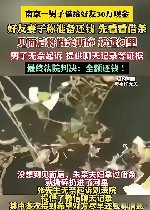 人心险恶!南京一男子借给好友30万现金,万万没想到好友妻子称准备还钱,但要先看看借条,趁机将借条撕碎扔进河里!男子无奈起诉,而法院的判决亮了! 这事发生在南京,张先生和朱某是认识十几年的老伙计。当年朱某说要开个小厂子,手头周转不开,哭着喊着找张先生借钱。张先生念着多年的情分,二话没说,从自己的积蓄里凑了30万现金,连利息都没提,就这么给了朱某,还让他写了张借条,说都是兄弟,走个形式。 这之后好几年,朱某绝口不提还钱的事。张先生也不好意思催,想着兄弟有难处,再等等。直到去年,朱某的厂子越做越大,还换了新车,张先生家里刚好要给孩子买房,才硬着头皮提了还钱的事。 一开始朱某还打哈哈,说“兄弟放心,钱肯定给你”,后来就开始躲,电话不接,微信不回。张先生急得上火,却又拉不下脸撕破脸皮。 转机出现在今年春天,朱某的老婆突然主动联系张先生,说“张哥,我们准备还钱了,你把借条带来,我们核对一下就给你打款”。张先生当时还挺感动,觉得这两口子总算良心发现了。 见面那天,朱某老婆一接过借条,脸色瞬间就变了。她没提还钱,反而一把将借条撕得粉碎,当着张先生的面,把碎纸片一股脑扔进了旁边的秦淮河。朱某在旁边冷笑,说“借条没了,你拿什么证明我们借过钱?” 张先生当时脑子一片空白,气得浑身发抖,指着他们说不出话。他怎么也想不到,自己掏心掏肺帮过的兄弟,会用这么下作的手段赖账。 回到家,张先生越想越憋屈,最后还是决定走法律途径。他把自己和朱某夫妇的微信聊天记录、当年取钱的银行流水、还有几个知情朋友的证言都整理了出来,一纸诉状把朱某告上了法庭。 法庭上,朱某夫妇一口咬定,借条是张先生自愿给他们销毁的,钱早就还了,还反咬一口说张先生敲诈勒索。 但法院没有被他们的谎言迷惑。法官仔细审查了所有证据,发现聊天记录里,朱某老婆多次提到“等我们凑齐钱就还你”“借条我们先收着,钱到位就给你”,这些内容和朱某夫妇“钱已还清”的说法完全矛盾。再加上银行流水和证人证言,形成了完整的证据链。 最终,法院判决朱某夫妇全额返还张先生30万元。判决书下来那天,张先生拿着纸,手都在抖。他说,钱能不能要回来是其次,重要的是,公道还在。 这事说起来真让人寒心。我们总说“谈钱伤感情”,可真正伤感情的,从来不是钱,而是那些拿感情当幌子、把别人的善良当软肋的人。 你以为的“兄弟情深”,在有些人眼里,可能只是可以利用的工具。你掏心掏肺帮他渡过难关,他转头就想把你踩进泥里。这种人,不仅丢了诚信,更丢了做人的底线。 更值得深思的是,朱某夫妇以为撕了借条就能赖账,却忘了在这个时代,证据早已不只是一张纸。微信聊天记录、银行流水、证人证言……这些看不见的“证据”,比一张纸更有分量,也更能戳破那些精心编织的谎言。 我们当然愿意相信人心向善,但也必须学会保护自己。借钱给别人,一定要保留好所有证据,不要因为是“朋友”“兄弟”就掉以轻心。善良可以有,但不能没有锋芒。 各位读者你们怎么看?欢迎在评论区讨论。