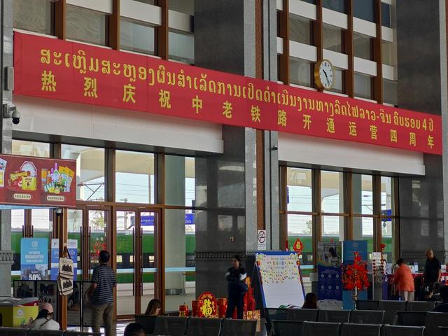 万象站内,庆祝中老铁路开通运营四周年的横幅