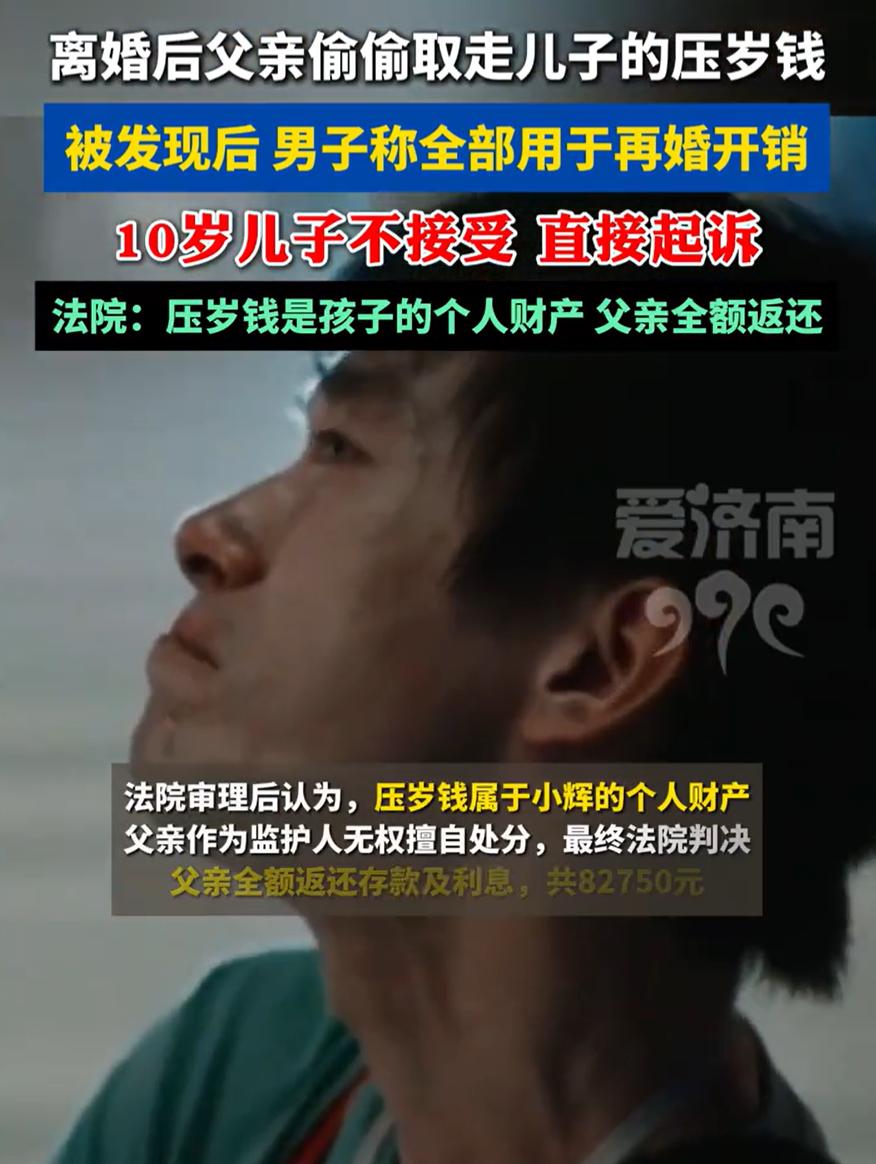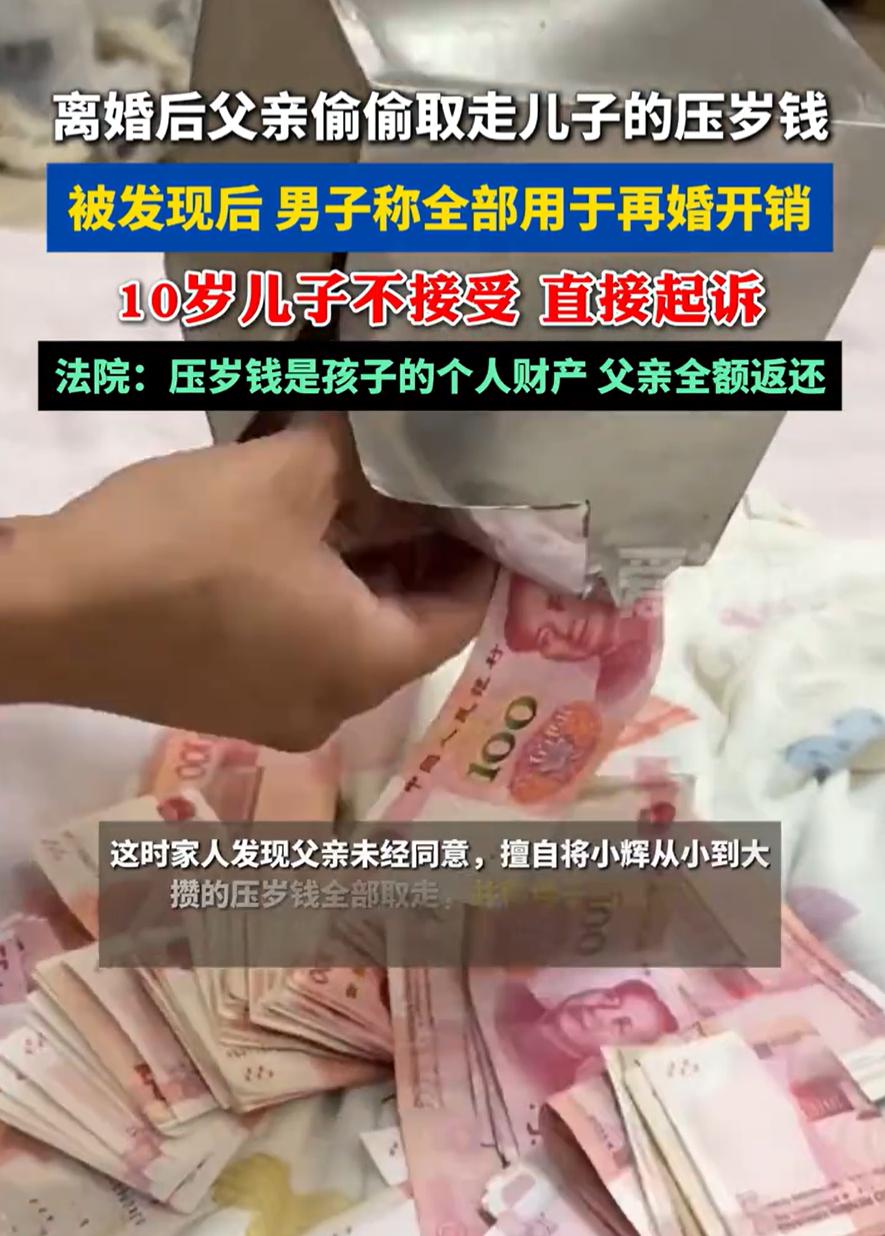 这当爹的也太不像话了!河南郑州,男子离婚后带着10岁的儿子一起生活,后来男子选择再婚,把儿子送到前妻那里,可在送之前,他把儿子多年攒下的8万多压岁钱都给偷走,说是用来结婚了,儿子直接将其起诉,法院判了 小辉在爹妈离婚后跟着爸爸过。没几年,爸爸打算再婚,办喜事总得花钱,这当爹的手头紧,结果就把主意打到了儿子身上。小辉从小到大攒的压岁钱,一直存在卡里,加起来有八万多块 这当爹的也没跟孩子商量,自个儿跑银行全给取出来,直接花在了结婚这档子事上 后来小辉被送去跟妈妈生活,一查账户,发现钱没了。去找他爹问,那当爹的说得还挺理直气壮:我是你爹,你的钱不就是我的钱?我结婚花钱,用用咋了? 小辉这孩子也是个性情中人,没被这话糊弄住。在妈妈的支持下,他一纸诉状把亲生父亲告上了法庭。最后法院判了,爹必须把钱全数还给儿子,连本带利一共八万多,一分都不能少 这事儿要是搁二三十年以前,估计没几个孩子能想到去告,告了也未必能赢。那时候很多人的观念里,孩子的压岁钱叫啥?叫人情往来。你收到的,都是大人给出去的,本质上还是这个家的钱,爹妈花那不是天经地义?但法院这次判得很清楚 压岁钱这东西,法律上叫赠与。长辈给了孩子,孩子接了,这钱的所有权就归孩子了,跟家里的买菜钱、水电费不是一回事 爹妈是监护人,有保管的权利,但没随便花的权利,除非这钱花在了孩子身上,比如交学费、看病。拿来给自己结婚用,那叫侵犯孩子财产权 这事其实有个挺值得琢磨的地方。一个十岁的孩子,得是多信不过自己的父亲,才会走到起诉这一步?或者说,当爹的得是多不把儿子的感受当回事,才会觉得偷偷取光孩子攒了这么多年的钱,拿去给自己办婚事,这事儿孩子能接受?