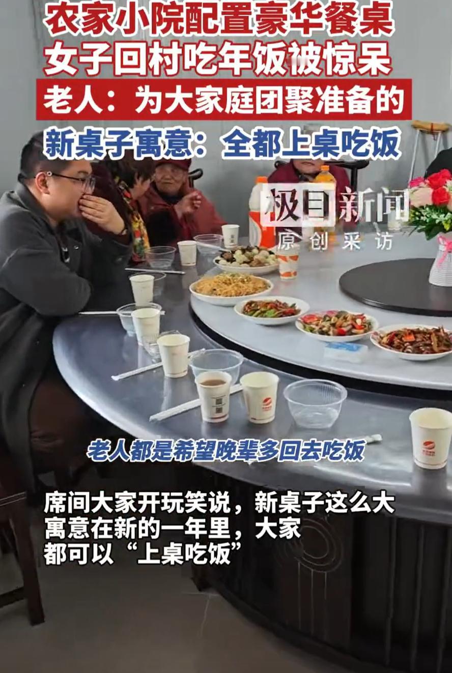 湖北武汉,女子和家人去村里探亲,本想着乡下环境比较简陋,把礼送到就走了,可到了饭点老人却把旧桌子换成了豪华超大电动餐桌,这让女子相当意外,而老人一句大家都能“上桌吃饭”,也是让人泪目 大年初二那天,武汉的张女士带着一家人去乡下走亲戚。说实话,去之前她心里还有点打鼓,毕竟农村条件摆在那儿,老人家一个人住,屋子也旧,吃饭肯定就是将就一下。她想着,礼送到,人到了,坐一会儿就走,别给老人添麻烦 可一进门,她就愣住了 堂屋正中央,摆着一张锃亮的电动大圆桌,转盘玻璃都能照出人影来,整整能坐下十五个人。要不是墙上还挂着老日历、贴着旧年画,她真以为自己走错了地方,进了哪家饭馆的包间 张女士记得很清楚,去年春节来的时候,老人家还是一张又小又旧的老方桌,几个人挤在一起,筷子都伸不开。今年这变化,简直像换了个人家 老人看到他们来了,笑得眼睛眯成一条缝,一边招呼大家坐下,一边用手摸着转盘给她们看,嘴里念叨着,今年换了个大的,还是电动的,想吃什么转一下就行,不用站起来够。语气里透着点儿小小的得意,像个小孩子展示新玩具 饭吃到一半,老人突然说了句话,让张女士鼻子一酸。老人说,换这张大桌子,就是想着,以后大家都能上桌吃饭,一个都不落下 上桌吃饭,这四个字听着普通,可张女士心里明白,老人说的不止是吃饭 以前桌子小,人一多就坐不下,总得有人端着碗去旁边吃,或者干脆等下一拨。老人嘴上不说,心里肯定不是滋味。这回换了新桌子,就是想告诉孩子们,今年回来,谁都不用站着,谁都不用等,一家人整整齐齐坐在一起,热热闹闹吃顿饭 其实想想也是,农村也好,城市也罢,对老人来说,最金贵的东西从来都不是什么山珍海味、高楼大厦。一张能坐下全家的桌子,一顿热腾腾的团圆饭,儿孙绕膝,说说笑笑,这就够了