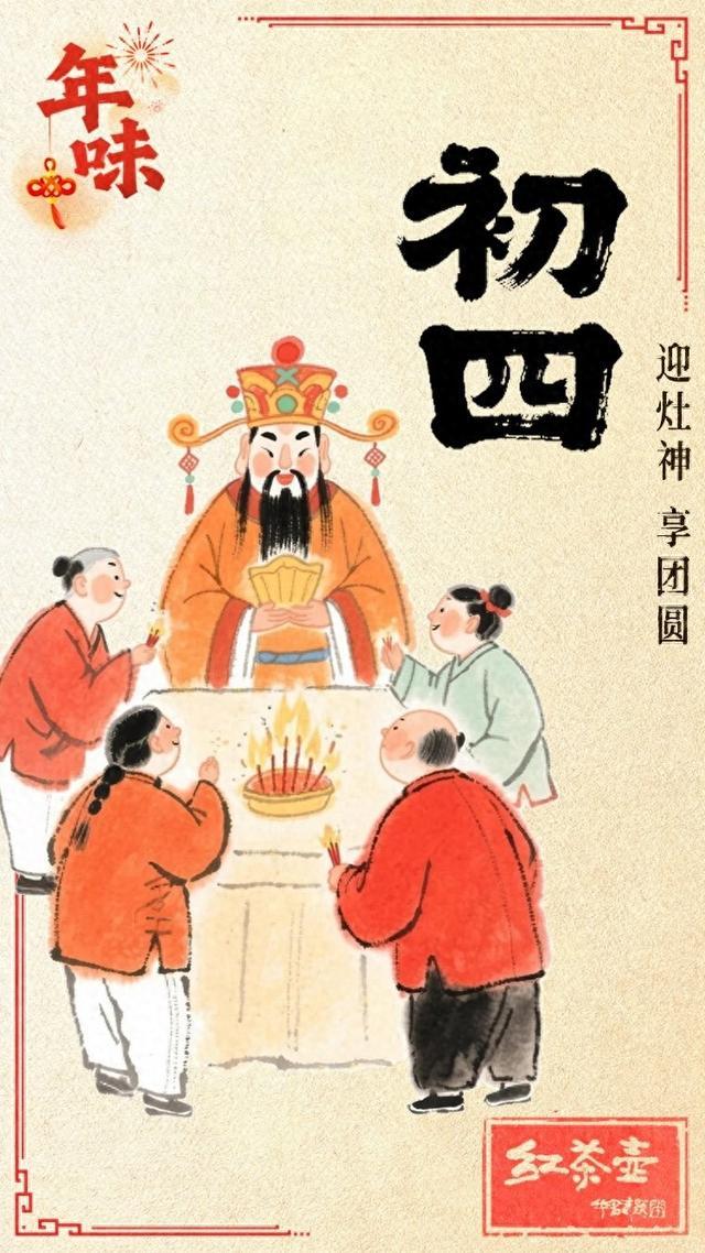 农历正月初四,又称为羊日,是传统民俗中迎接灶神回人间的日子。“灶神”,又叫灶王、灶君、灶王爷,是中国古代神话传说中的司饮食之神。腊月二十三前后,负责在人间监察善恶的灶王爷上天述职。在完成述职后,灶王爷在大年初四时返回人间。山东民间有“大年初四不出户,灶神好往家里驻”的说法。传说灶王爷返回人间后便要清点户口,所以正月初四家家户户都要守在家里,准备丰富的果品,焚香点烛,以迎接灶神的到来。