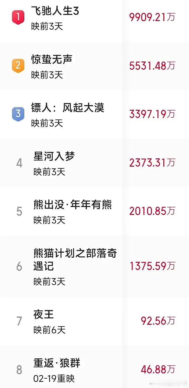 《镖人》上映三天,票房只有3.7亿多。很不理想,只排到第四名。反观前三名,《飞