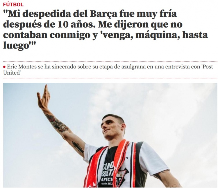 蒙特斯说道:“我当时就知道了,因为梯队那一年升入了西乙,而我没有那个水平,我们实话实说吧。我提前两个月就知道了。最后一天,我们和当时青训主管进行了一次单独谈话,就这样。我记得我在巴萨的告别非常冷淡,在待了十年之后。他们告诉我,我不在他们的计划内,我不能留下了,然后就是'好了,哥们,再见吧'。就是这样。”