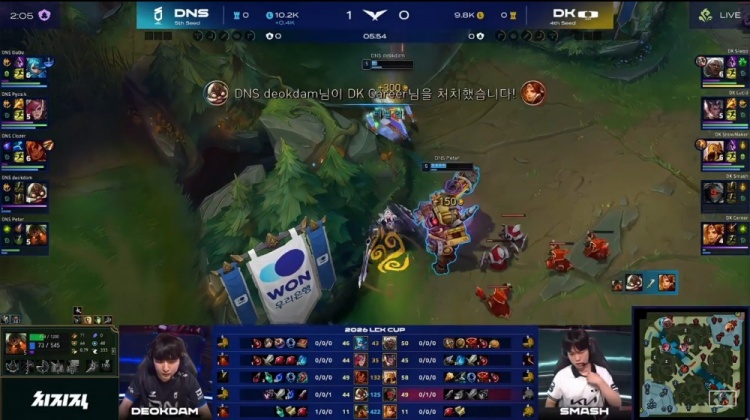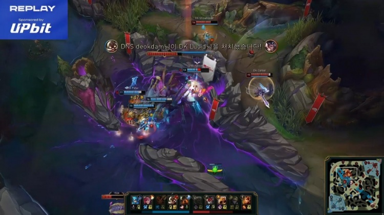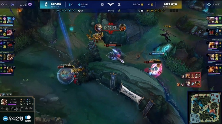 [14:35]野区团战,Luicd赵信被DNS三人追击致死,许哥沙皇包夹过来与队友前后夹击,Smash双杀收割,Career点火带走pyosik,DK打出1换4,双方经济持平。