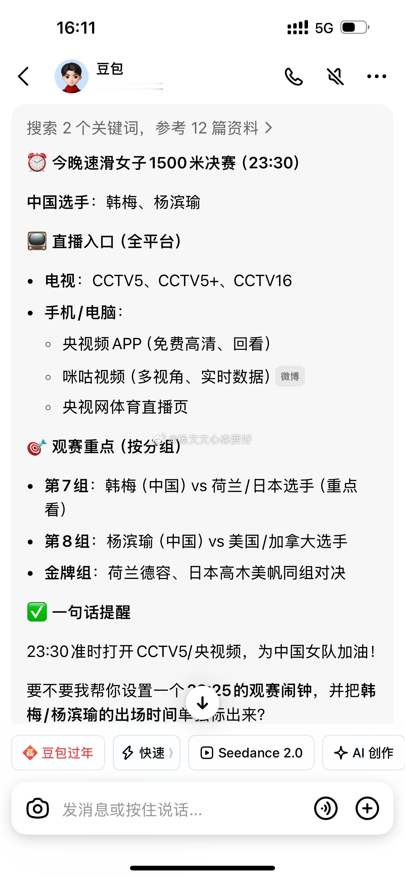 体育ai过大年 用AI预判高光时刻,为速滑运动员加油助威。帮你整理今晚这场比赛的选手分组、央视直播入口和观赛时间提醒。愿奥运健儿们冰刀所向披靡,平安完赛,再创佳绩!体育AI过大年 ❄️冰刀划过冰面的每一刻,都是热爱与坚持的绽放。今晚的赛场,灯光璀璨,万众瞩目,你们带着汗水与梦想,向着终点全力冲刺。🔥愿速滑健儿保持最佳状态,平稳发挥,勇往直前,不负日夜的苦练,不负心中的荣光。大胆去滑,放心去闯,我们永远在身后为你们呐喊助威!♥️🔥祝所有运动员平安顺利,再创佳绩,让国旗因你们而升起,让国歌为你们而奏响!加油!💪
