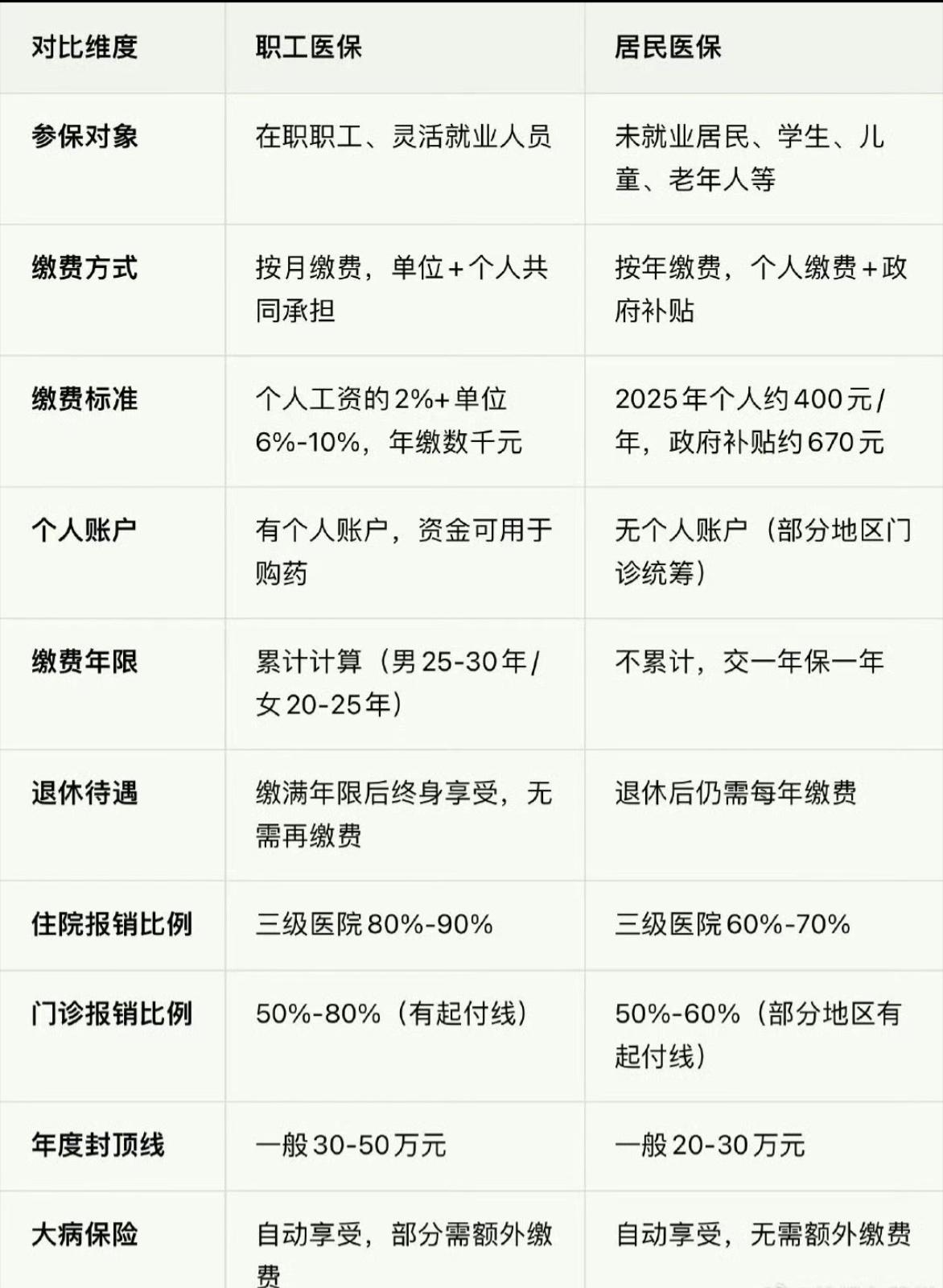 职工医保和居民医保的区别! 职工医保和居民医保作为我国对老百姓的基本保障,它们在缴费人群、待遇、保障上来说存在差异。 职工医保是对有工作单位或者稳定收入的人群,提供高标准、终身制的保障;居民医保则是对未就业的城乡居民,提供一年一保的基础性兜底。 注意:两者不能重复参保,也不能重复享受报销待遇。职工医保报销