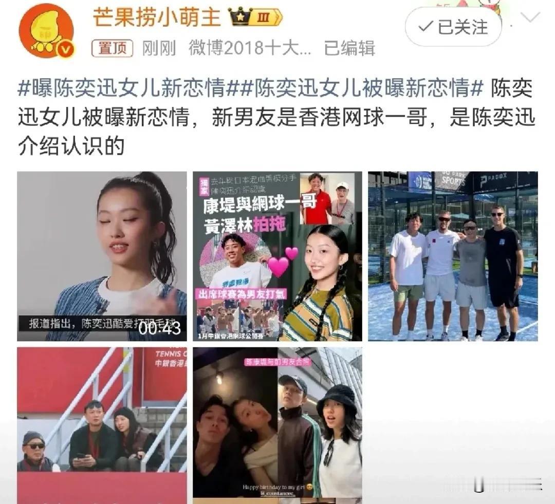 陈奕迅女儿,登上热搜! 陈奕迅当“媒人”!21岁女儿新恋情冲上热搜,男方是香港网球一哥 2月20日,陈奕迅女儿陈康堤因为新恋情突然冲上热搜,这一次,网友发现“媒人”竟然是陈奕迅本人! 据悉,康堤的新男友是21岁的香港网球“一哥”黄泽林。两人同为2004年出生,青春正好。让人意外的是,这段缘分竟是陈奕迅牵的线 。 今年初的香港网球公开赛上,康堤就被目击现身看台。当时大家还以为她只是陪父亲看球,如今谜底揭开——原来是在为“绯闻男友”现场打气 。从球场到生活,两人社交平台互动频繁,黄泽林更是在康堤美照下留下火焰和爱心表情,青春恋情的甜蜜藏都藏不住 。 说起康堤的感情路,去年11月她才刚结束与日本混血男友的恋情,那段三年情最终退回朋友关系 。没想到仅仅三个月后,她就迎来了新的春天。 而这一次,最暖心的莫过于陈奕迅的角色。从台上唱尽爱情悲欢的“情歌天王”,到现实生活中为女儿牵线搭桥的“最强媒人”,网友直呼:“这个爸爸太懂女儿心了!”眼看着女儿经历了感情的起伏,他没有过多干涉,却用最温柔的方式为女儿打开了另一扇窗。 一个是乐坛天王的掌上明珠,一个是香港网球的希望之星,这段“文体恋”来得刚刚好。祝福两个21岁的年轻人,在各自的赛场上发光,也在彼此的世界里取暖。