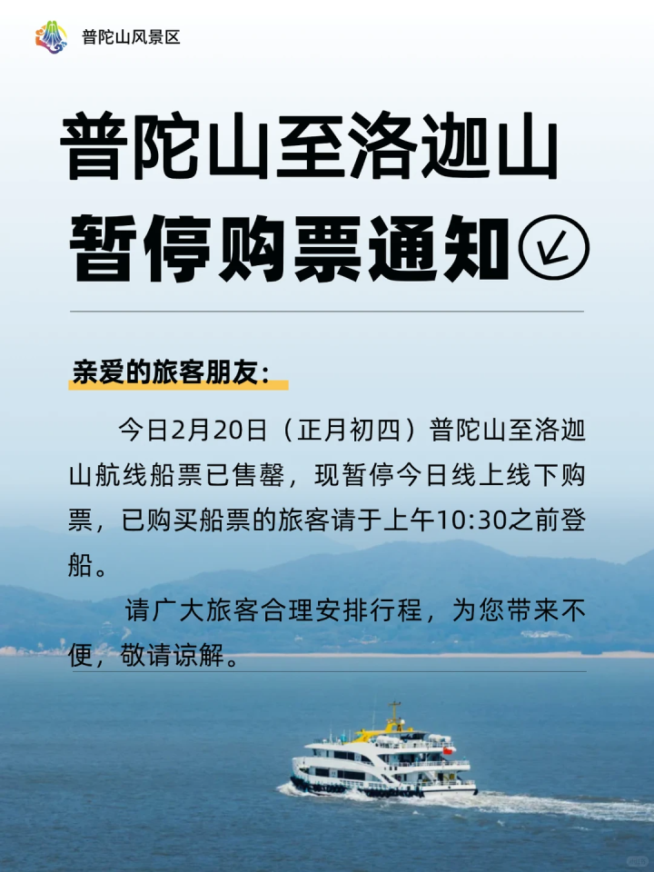 今日2月20日(正月初四)普陀山至洛迦山航线船票已售罄,现暂停今日线上线下购票,已购买船票的旅客请于上午10:30之前登船。