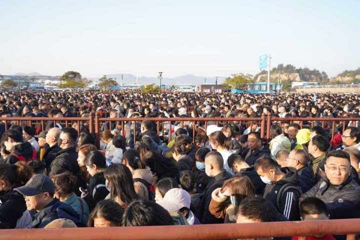 普陀山蜈蚣峙码头,人山人海,排队坐船去普陀山的游客人挨着人,一眼望不到尽头。