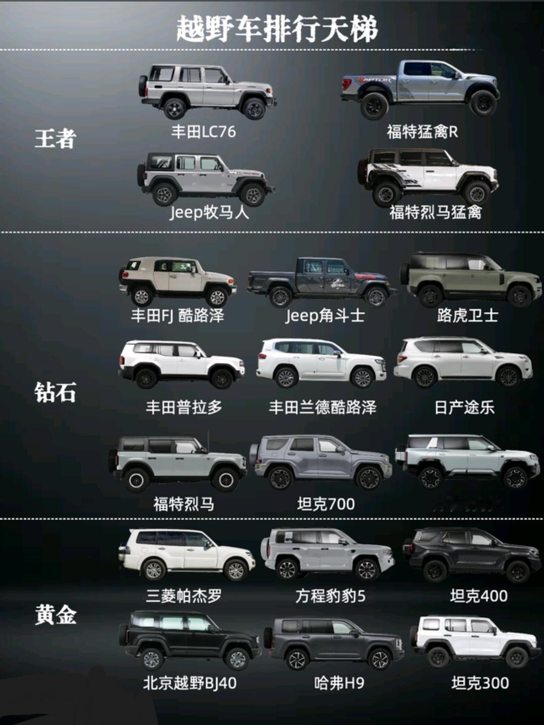 硬派越野王者段位,低调的选丰田LC76,硬核玩家的终极梦想; 高调的选福特猛禽,性能猛兽,沙漠穿越无所不能; 不高不低的选Jeep牧马人,攀爬界的扛把子,玩法无限。 坦克以安全可靠著称,算不算硬派越野王者?