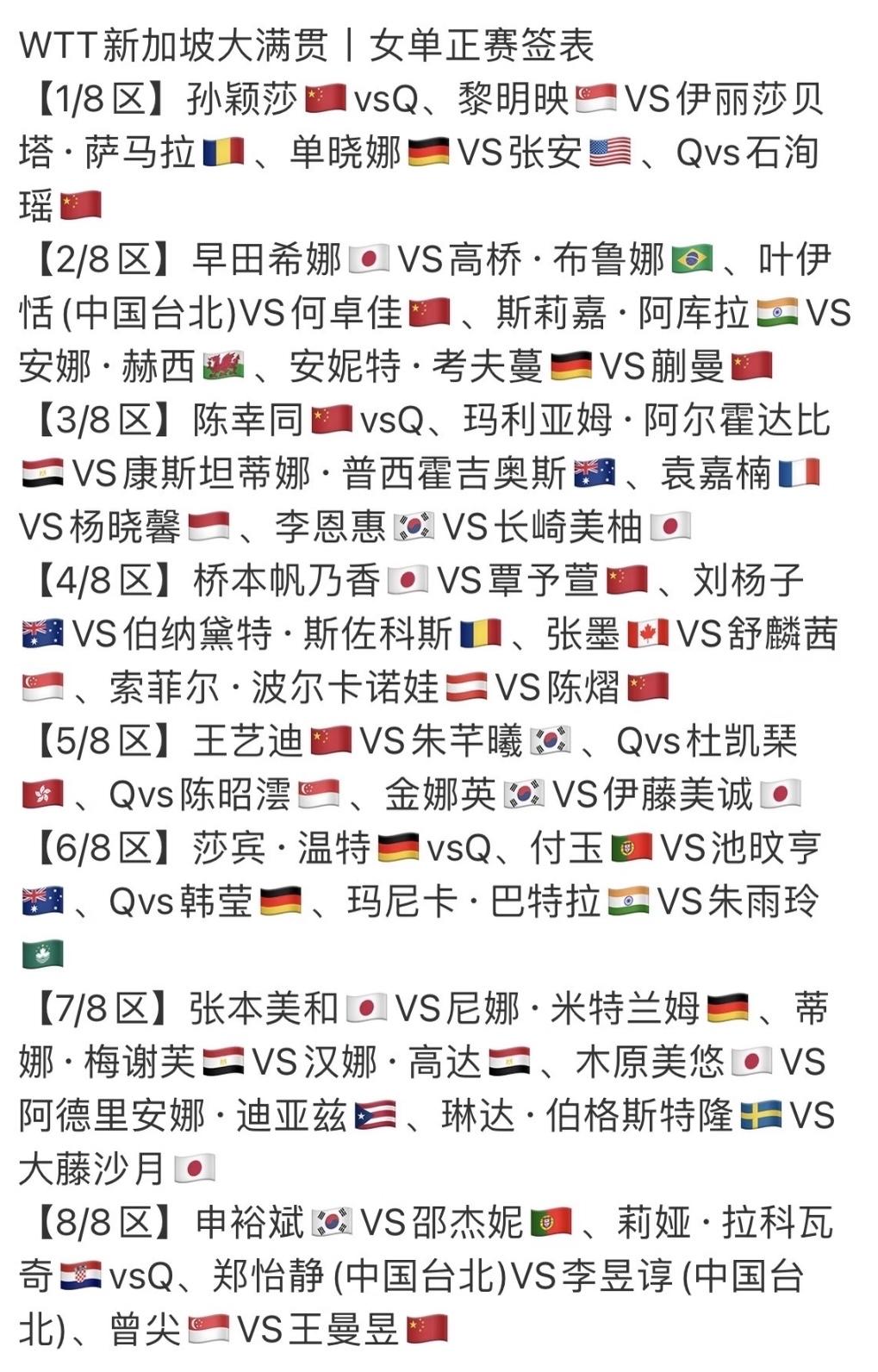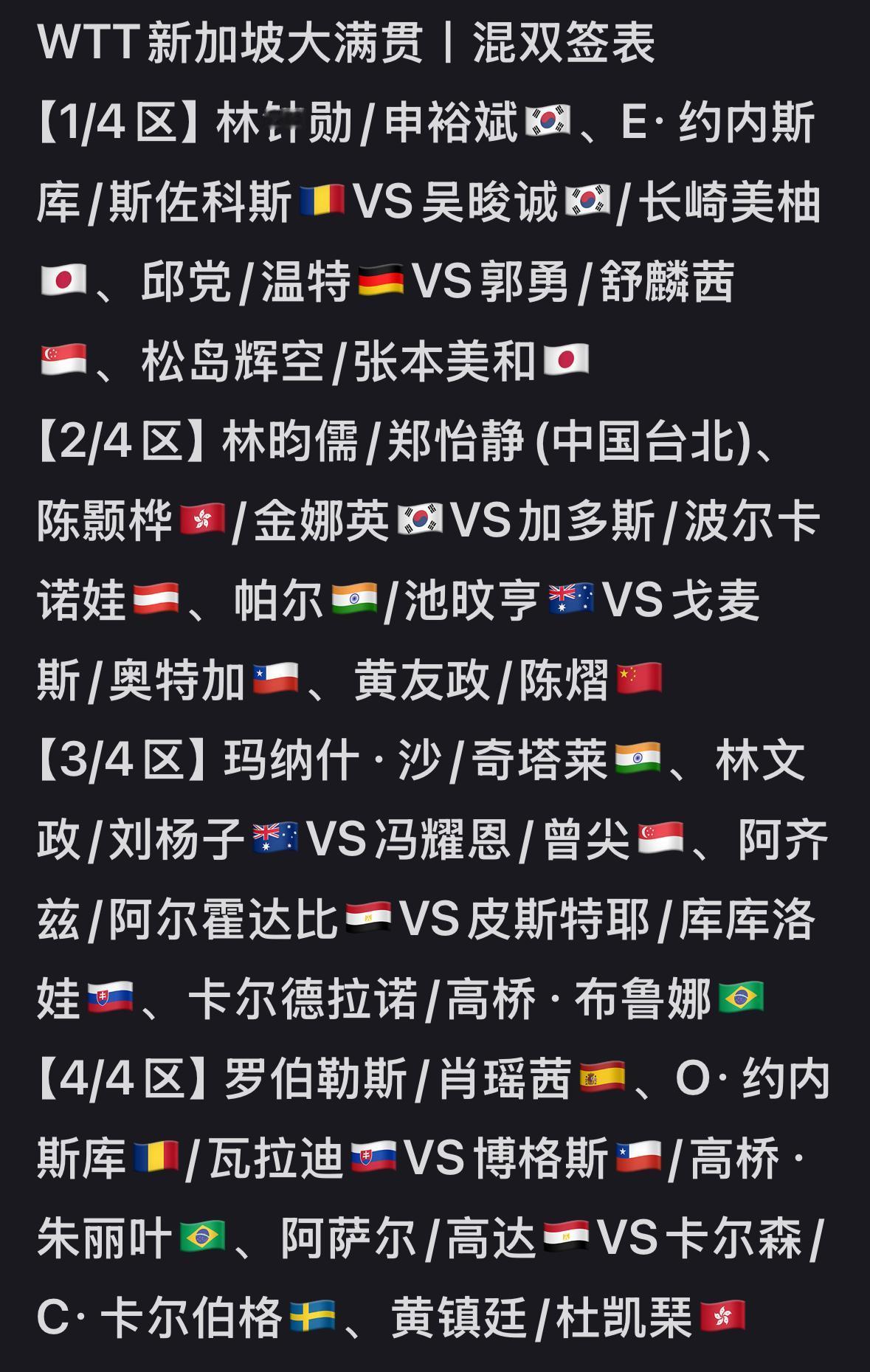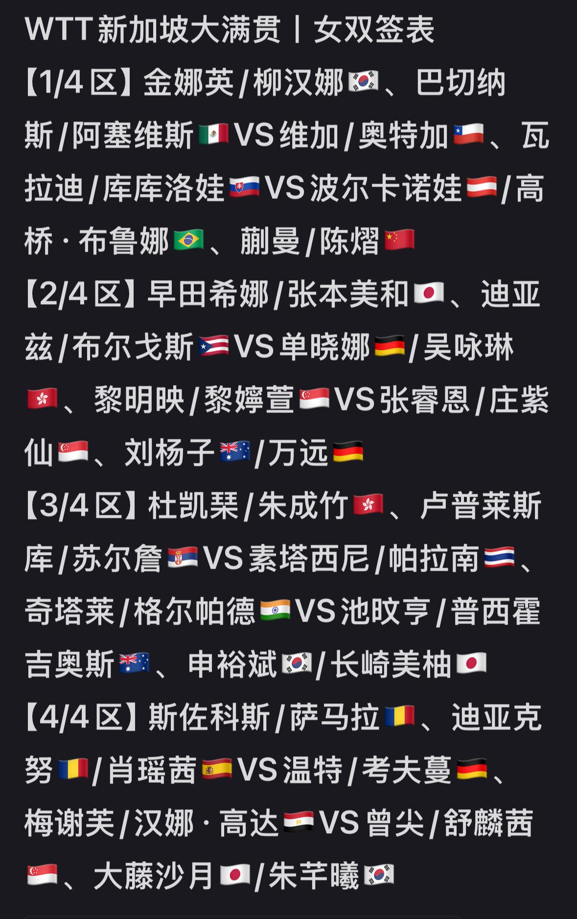 2026新加坡大满贯双打签表出炉 黄友政/陈熠唯一一组混双, 首轮打资格赛选手, 上半区与日乒强敌张本美和/松岛辉空一个半区, 林昀儒/郑怡静也在上半区, 黄友政/陈熠都是身兼三项, 拼就完了! 蒯曼/陈熠的女双也在上半区, 首轮打资格赛选手, 感觉蒯曼/陈熠的女双培养起来了, 男双方面, 黄友政/林诗栋在下半区, 签位不错👍, 邱党/杜达是第一目标, 第二目标就是港队, 然后打败新加坡队, 进入决赛, 林诗栋/黄友政这组男双打出来 对洛杉矶奥运会是非常有利的! 国乒队加油!