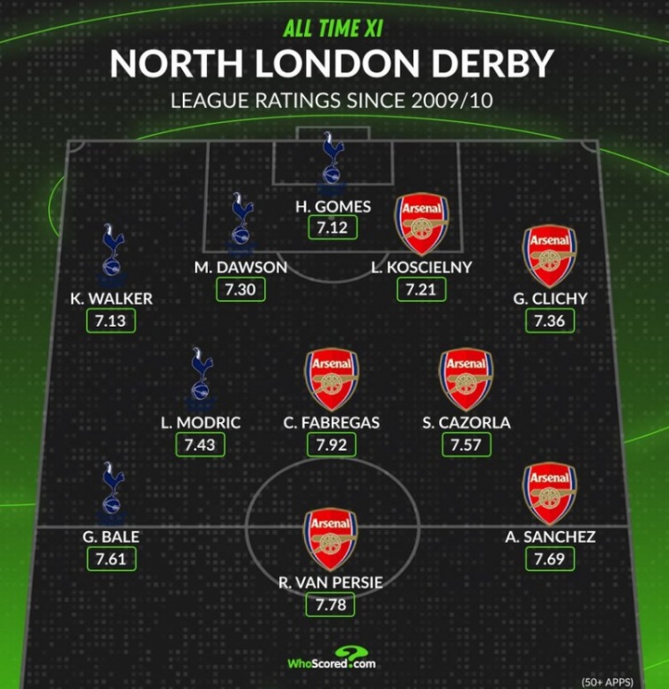 直播吧2月20日讯本轮英超将迎来焦点战北伦敦德比,数据网站Whoscored也盘点了自09/10有统计以来,阿森纳+热刺球员在英超场均评分最高阵容(至少50次出场),具体如下: