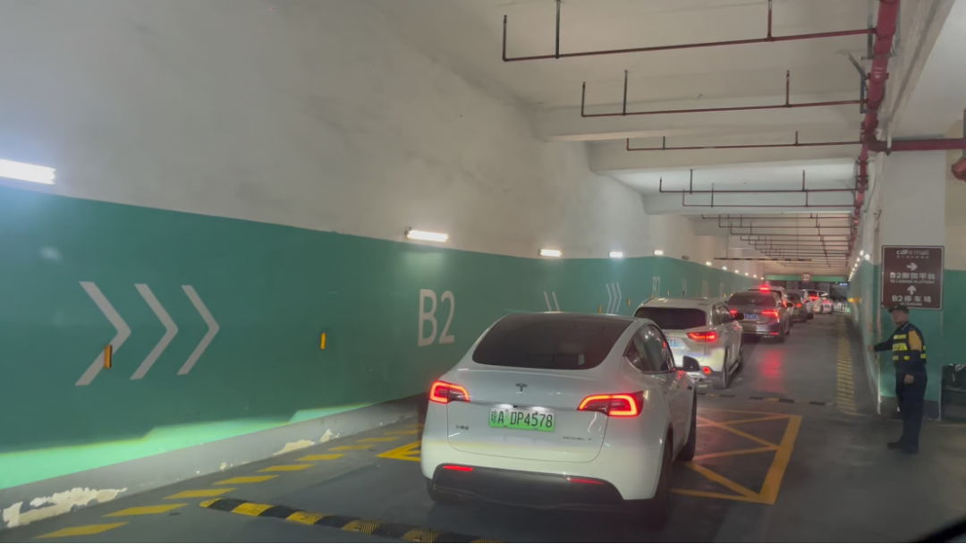 同一时间,位于海口新海港的cdf海口国际免税城车库入口处已排起百米长队,车辆在工作人员的引导下依次驶入车库。