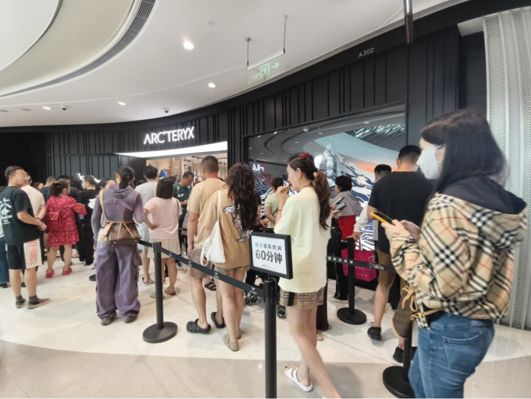 今年,进口腕表等区域人气有所回落,而户外运动服饰则异军突起,备受青睐。始祖鸟门店内,众多游客忙着试穿与三亚气温明显不符的热门款冲锋衣;店外,等待进店的消费者排起长队,队尾旁边设置着“预计排队时间60分钟”的提示牌。