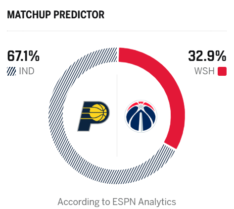 ESPN预测明日比赛:步行者胜率67.1%,奇才胜率32.9%