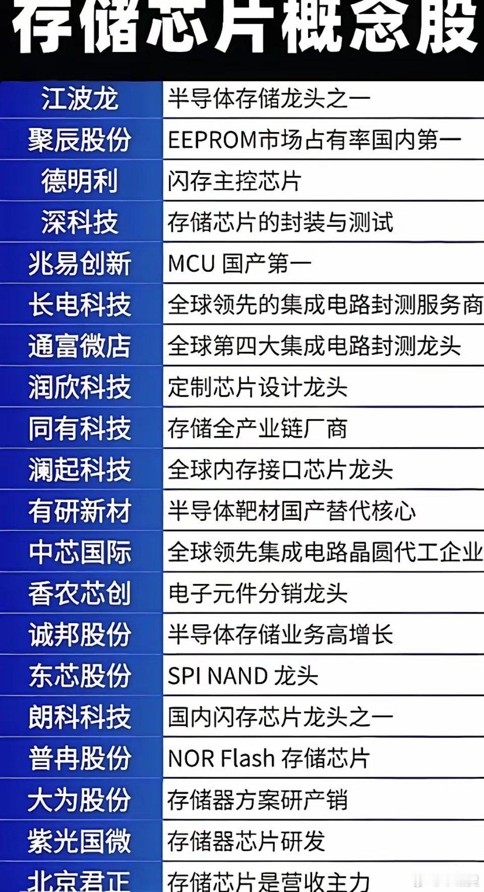 存储芯片概念股梳理📊近期存储芯片板块关注度提升,相关概念股各有侧重:江波龙、朗科科技等为存储龙头;聚辰股份、普冉股份深耕细分存储芯片;深科技、长电科技等覆盖封测环节;中芯国际则为晶圆代工核心企业。产业链上下游协同,国产替代进程持续推进。(注:以上信息仅供参考,不构成投资建议)存储芯片行情存储芯片芯片股行情存储芯片概念股存储芯片芯片股行情存储芯片概念股存储半导体行业半导体芯片股票存储芯片价格存储芯片技术