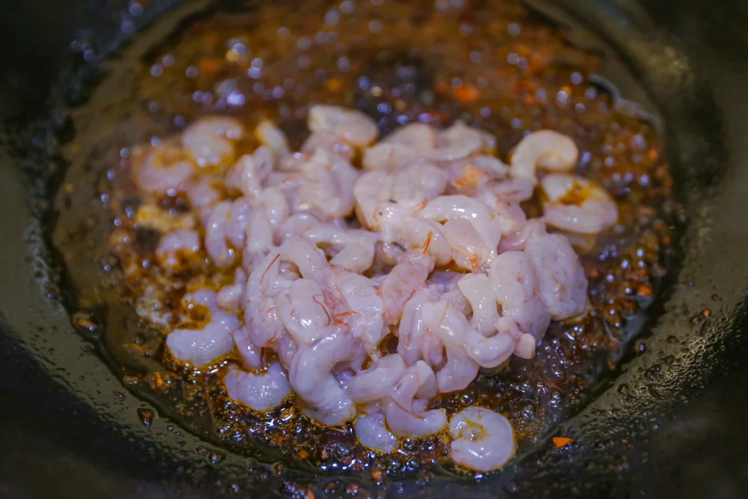 锅中放油,加入葱姜蒜炒香,放入火锅底料一小块,加入虾仁、豌豆、玉米颗粒加入适量的清水,滚开后放入食盐、白胡椒粉调味。