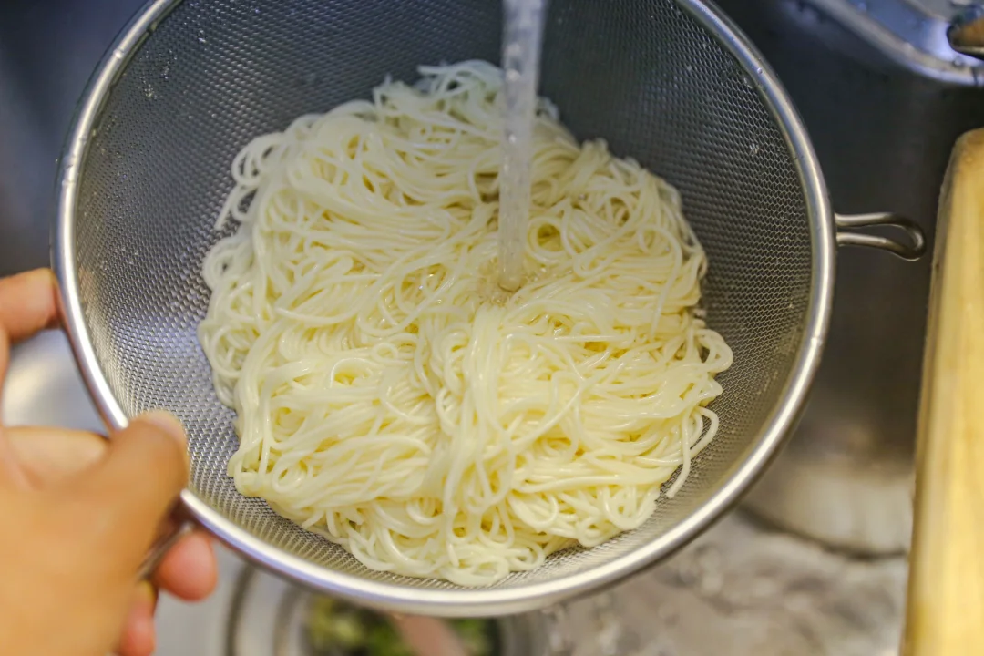 面条煮熟,用凉水冲洗几遍,放入碗中。