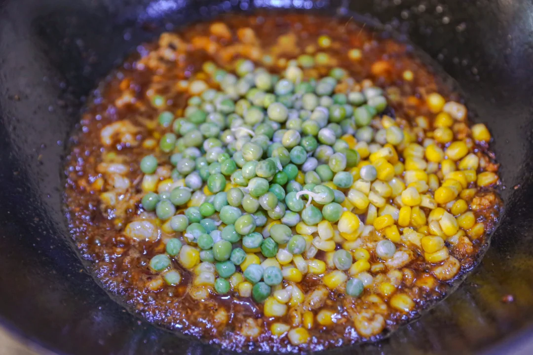 玉米、虾仁、豌豆三种不同的食材,三种不同的颜色。