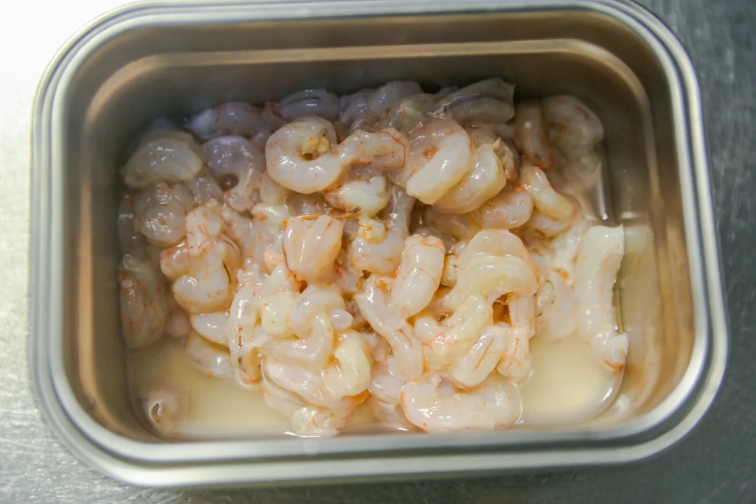虾仁清洗干净之后,控干水分。