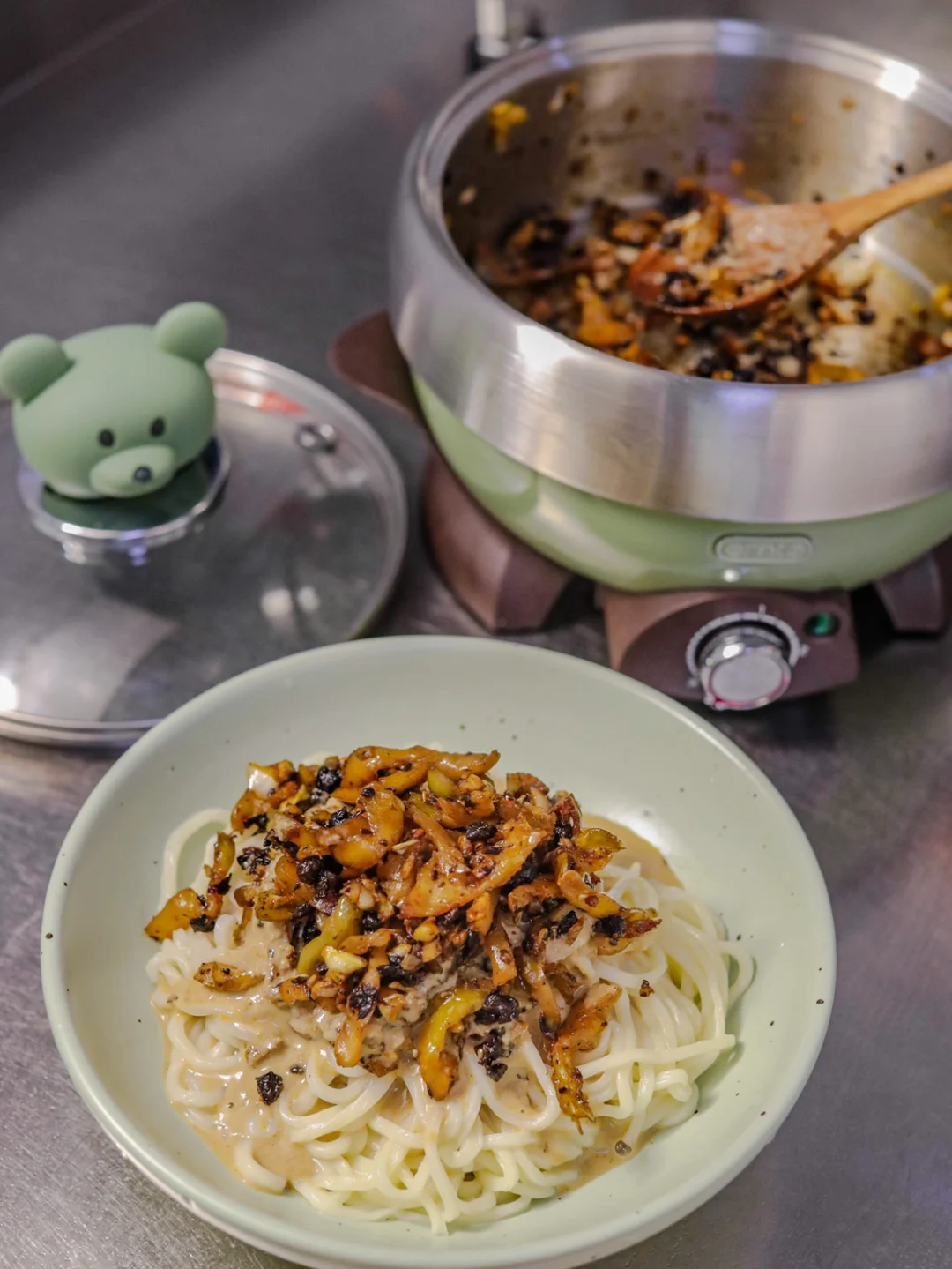 🌈做法特别特别的简单,芝麻酱加入等量的凉开水,加入一点食盐,用筷子顺着一个方向搅拌均匀。一个人在家,可以悠闲的享受做饭的时光,今天还特意用了朋友送给我的小绿锅,小熊盖垫很可爱~很喜欢~也为自己片刻安宁的午餐时光增添了一点氛围。