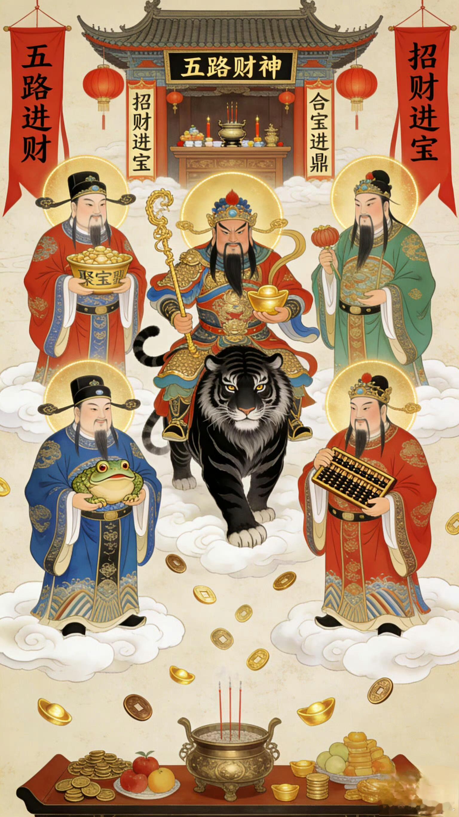 民间风俗:正月初五是武财神赵公明的诞辰,也是财神下界巡查人间、赐福送财的日子。