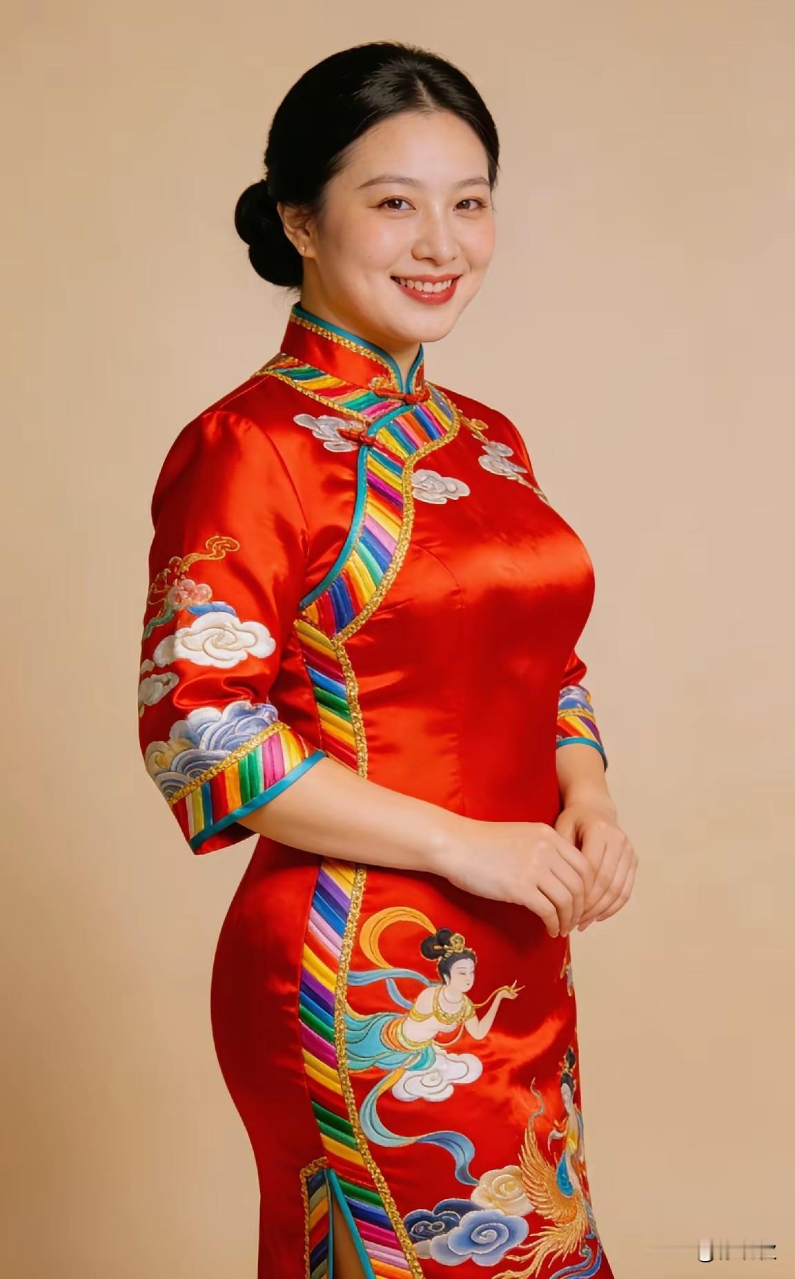 中国红色,红色旗袍。 东方文化,国风古韵。 满面春风,红红火火。 贴身裁剪,开叉