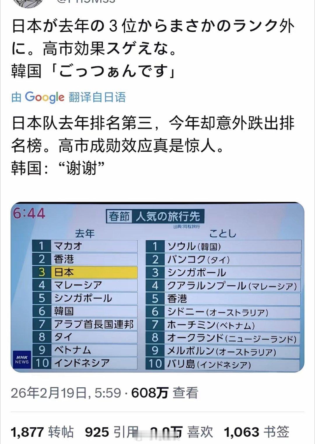 日本网民发帖,这条在日本有600万观看,3.2万点赞。 大概意思是,因为高市早苗效应,2026年日本跌出中国春节出境游前十国家(去年前三),而韩国则排名第一。韩国对日本说了声“谢谢”。