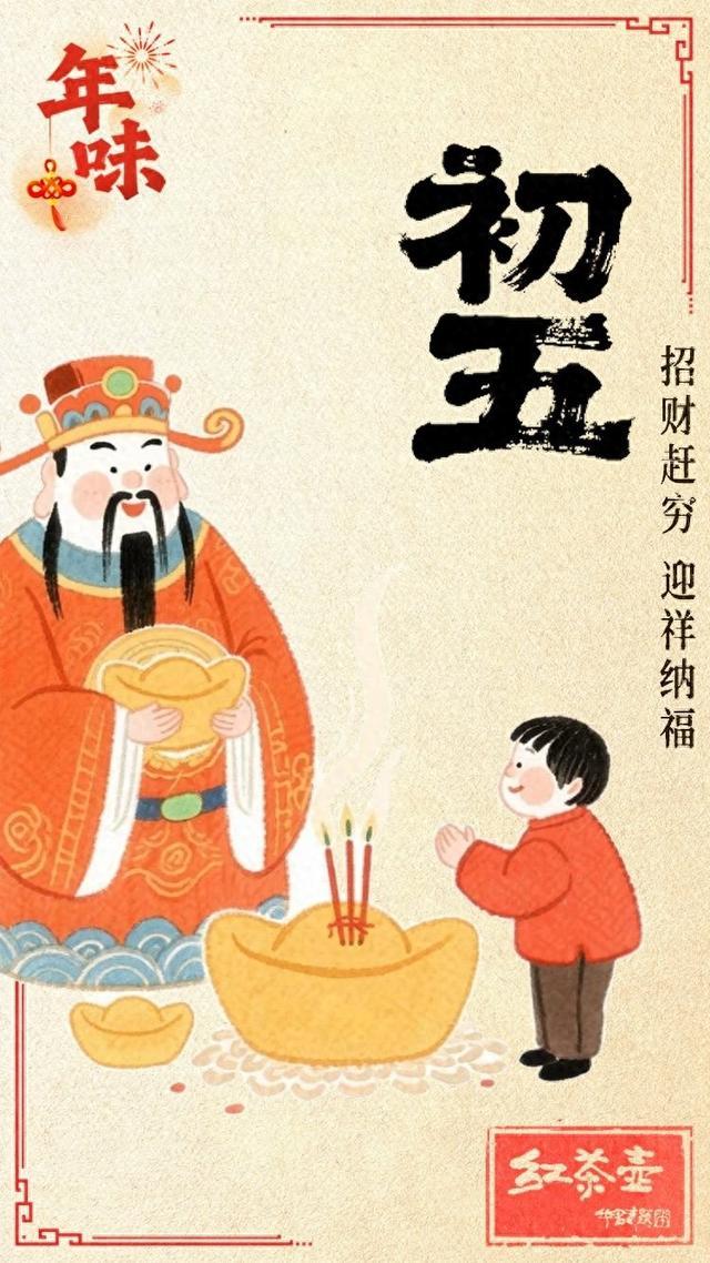 农历正月初五,民间相传是财神生日。这一天,人们打扫干净屋子、祭祀财神,将财神迎入家门,期盼一整年财源广进。此外,正月初五又称“破五”,有“送年”之意,在不少地区人们在黎明前便早早起床,准备贡品等,以此“赶五穷”,表达辟邪除灾、迎祥纳福的美好愿望。前几天的诸多禁忌也可以破除,过了这一天,人们的生活开始慢慢恢复到日常状态。