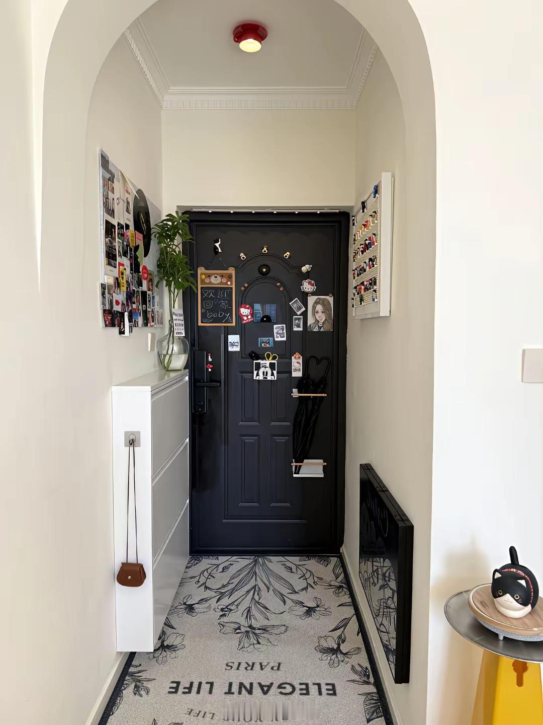 轻法式风格,拱形玄关像是给每天回家加了点仪式感。全屋乳白墙面配浅色实木地板,阳光透过白纱帘洒进来,温柔得不像话。顶角线和吊顶精致但不张扬,每一处都在说:小房子也有浪漫的资格。