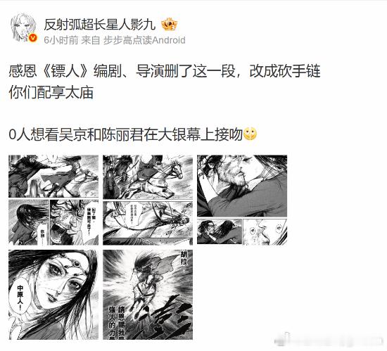 《镖人》电影删吻戏上热搜近日有人爆料,电影《镖人:风起大漠》删除原著漫画中刀马(吴京饰)与阿育娅(陈丽君饰)的吻戏,反而引发全网压倒性支持。漫画中阿育娅化身“大沙暴”复仇前主动吻别刀马,象征生死诀别,是其单恋情感的爆发。 电影彻底删除吻戏,改为阿育娅砍断象征过往的手链、高喊“我即是大沙暴”的复仇宣言,并通过生死诀别的眼神传递情感,弱化爱情线,专注其父仇与族群领导权的主线。高度契合角色设定与观众期待,甚至有人直接说,“配享太庙。”“0人想看吴京和陈丽君在大银幕上接吻”“印象里吴京就没拍过吻戏,这真拍了就有会种熟人作案的感觉”其实还有个原因,因为众所周知的四字女演员,陈丽君是补拍的,说是十几天就补拍完了,其中多少剧情改动不得而知,反正成果大家都满意