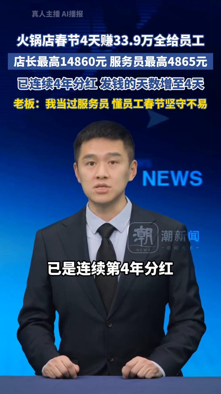 火锅店春节4天赚33.9万全给员工,店长最高14860元,服务员最高4865元,已连续4年分红发钱的天数增至4天。老板:我当过服务员,懂员工,春节坚守不易。 封面新闻。 火锅店春节4天赚33.9万全给员工,老板称我懂员工过年坚守的辛苦。 据封面新闻2月20日报道,四川遂宁一家火锅店老板黄厚明将春节前4天利润全分给员工,已是连续第4年分红,店长最高拿到14860元,服务员最高4865元,保洁阿姨也分到1447元。今年利润减少,行业艰难,他仍把分红从3天增至4天。 黄厚明表示我当过服务员,懂员工过年坚守的辛苦。他还为员工交齐五险一金,每月发"孝顺金"打给父母,有员工用分红交齐孩子学费,有人买车凑齐首付。黄厚明说我知道后比赚钱高兴。
